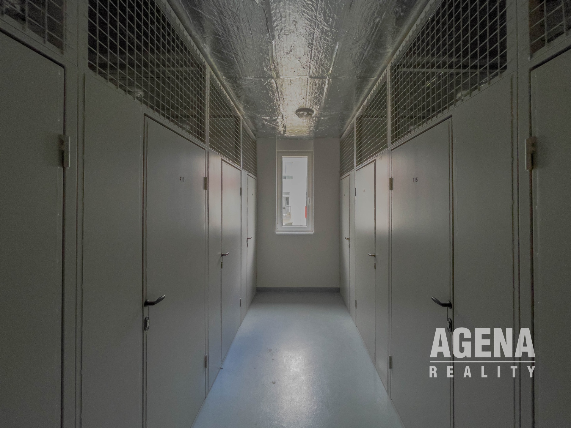 K bytu náleží prostorná sklepní kóje na stejném patře a garážové stání v suterénu domu.