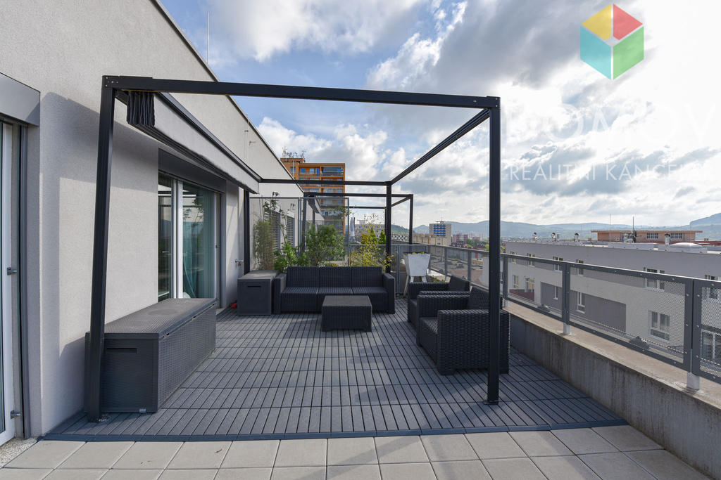 Nabízíme Vám k pronájmu opravdu pěkný byt o výměře 54,1 m2 s prostornou terasou a nádherným výhledem. Terasa má výměru 46,4 m2, je na ní venkovní posezení s osvětlenou pergolou se zatahovací střechou a další relaxační prostor. Vstup na terasu je z obývacího pokoje i z ložnice, na oknech jsou venkovní žaluzie.