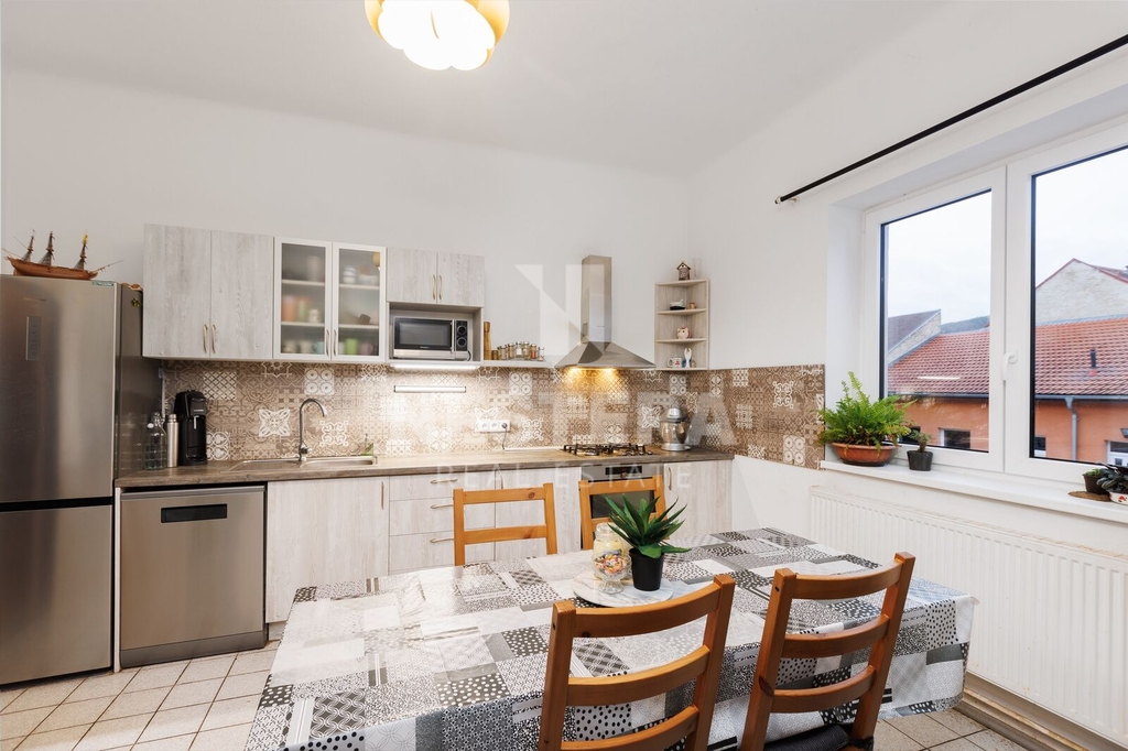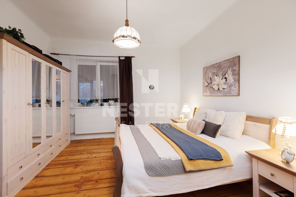 • BJ 4+1 s výměrou 108,29 m². Byt je rozdělen na předsíň, prostornou chodbu s vestavěnou skříní, samostatné toalety/technickou místnost (pračka, kotel), koupelnu s vanou, plně vybavenou kuchyni s výhledem do zahrady, pokoj pro hosty, obývací pokoj s krbovými kamny, dětský pokoj a ložnici.