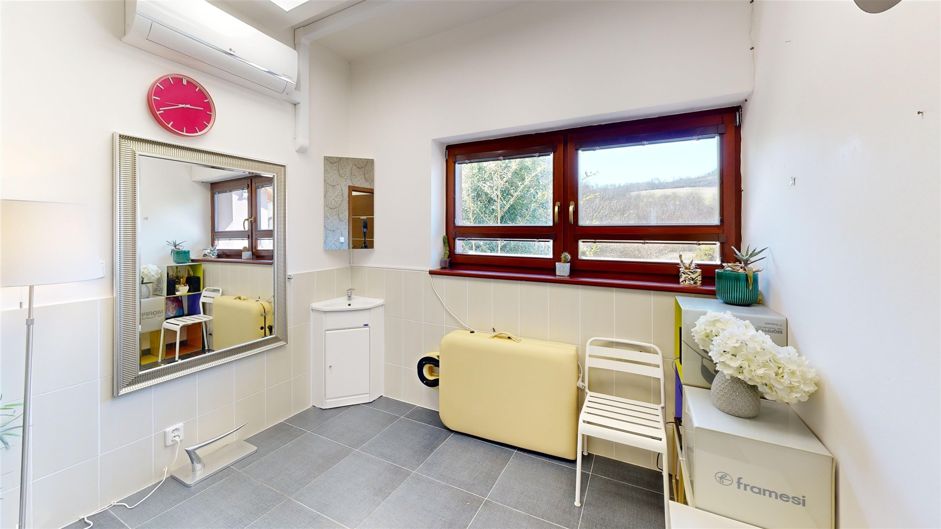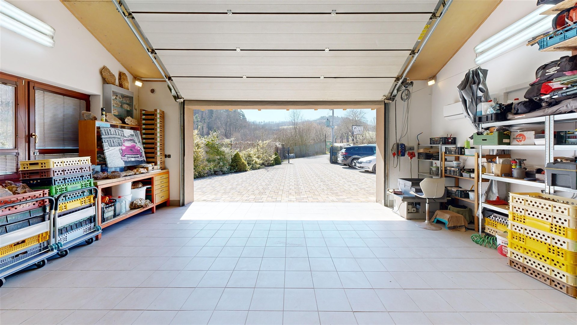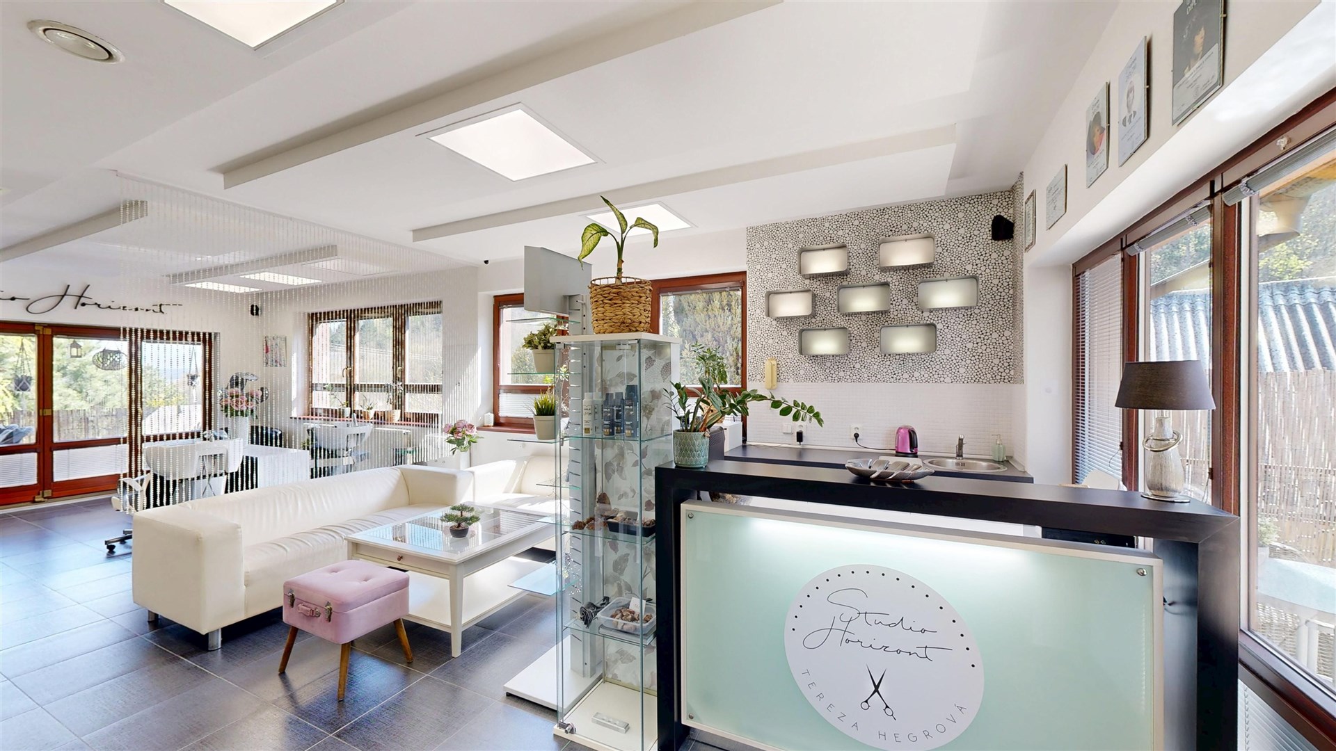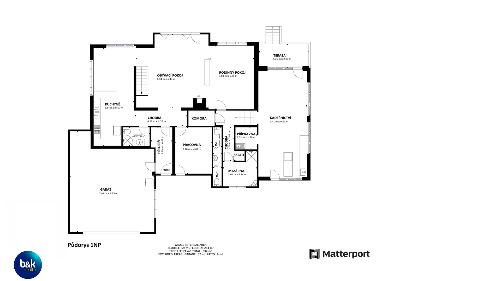 NP: obývací pokoj, kuchyně s jídelnou, pracovna, koupelna, kadeřnictví, garáž, komora