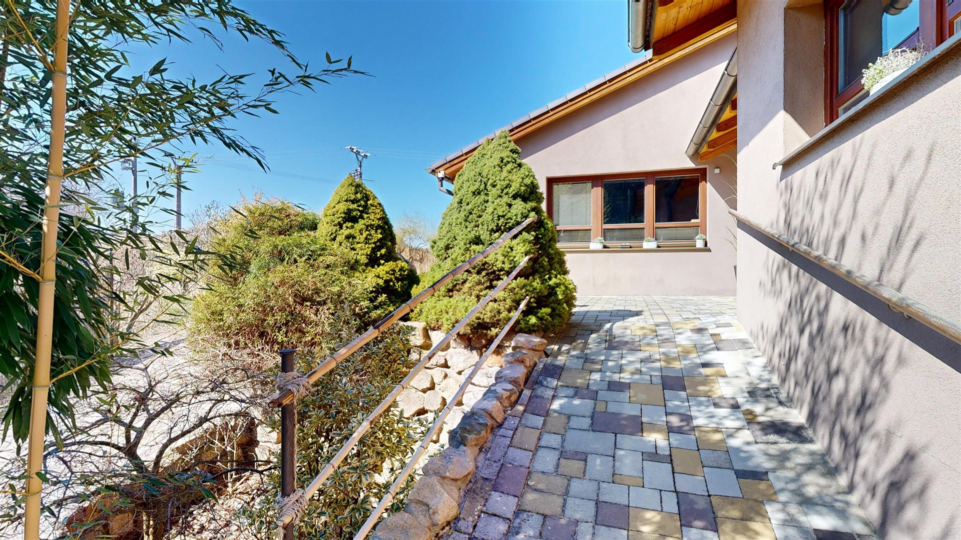 Nadzemní bazén, altán, voliéra, záhony, okrasné dřeviny (japonské javory, bambusy)příprava pro dvě okrasná jezírka