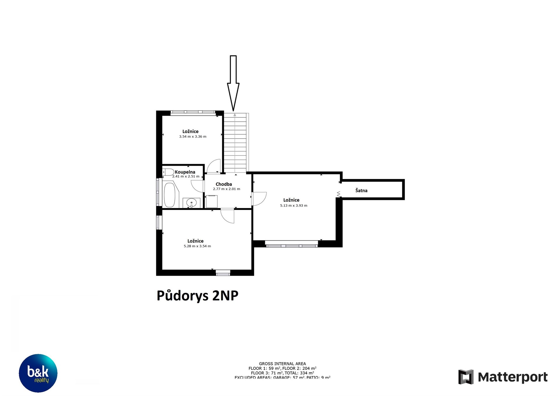 NP: tři ložnice, šatna, koupelna, chodba