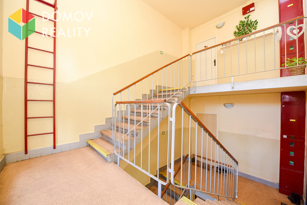 Byt se skládá z prostorné chodby, tří pokojů, obývacího pokoje, kuchyně, koupelny, samostatného WC a komory. K bytu náleží sklepní kóje o výměře 1,2 m².