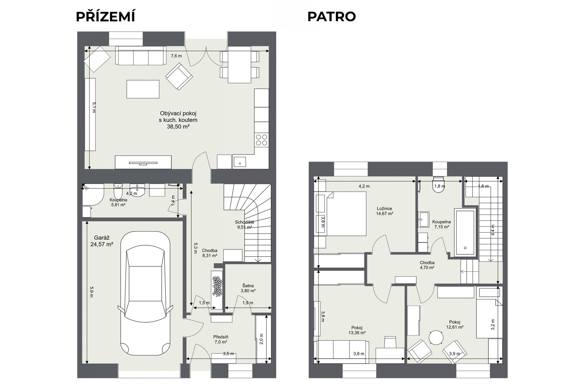 Dům nabízí celkovou užitnou plochu 150 m² včetně garáže. Praktická dispozice je ideální pro rodinné bydlení i pro náročnější klienty, kteří hledají komfort a funkční prostor bez kompromisů. Velkou výhodou je, že na každém podlaží se nachází koupelna, což výrazně zvyšuje pohodlí každodenního provozu. V obytných podlažích je instalováno podlahové vytápění a příjemnou atmosféru doplňují krbová kamna.