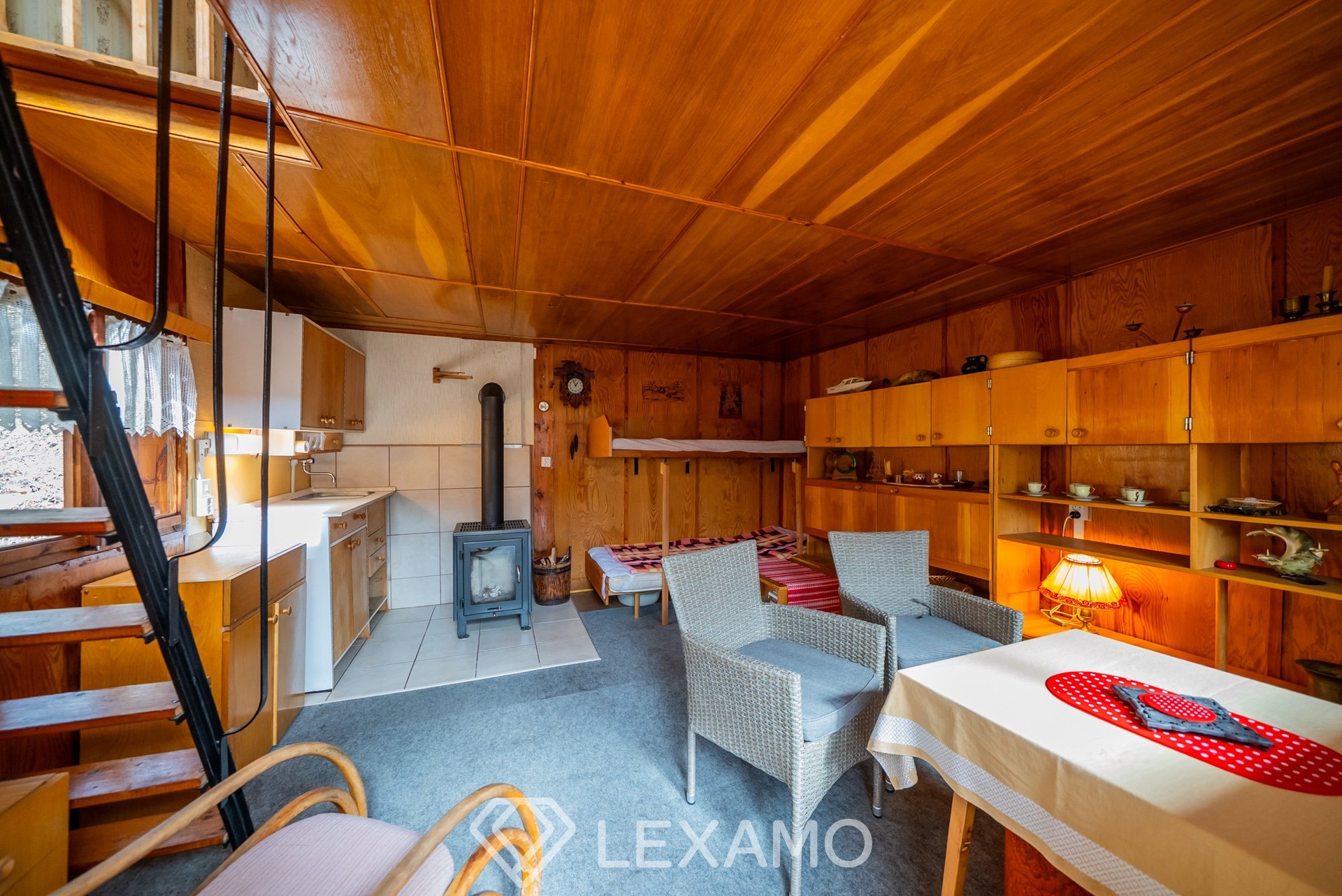 Dispozice je prakticky rozdělena do tří podlaží. Vstupní část tvoří prosklená veranda, která přirozeně propojuje interiér s okolní přírodou a nabízí příjemné místo k posezení. Na ni navazuje obytný prostor s kuchyní. V podkroví se nachází prostor vhodný ke spaní. V suterénu je k dispozici koupelna se sprchovým koutem a průtokovým ohřevem vody, dále dílna a technické zázemí.