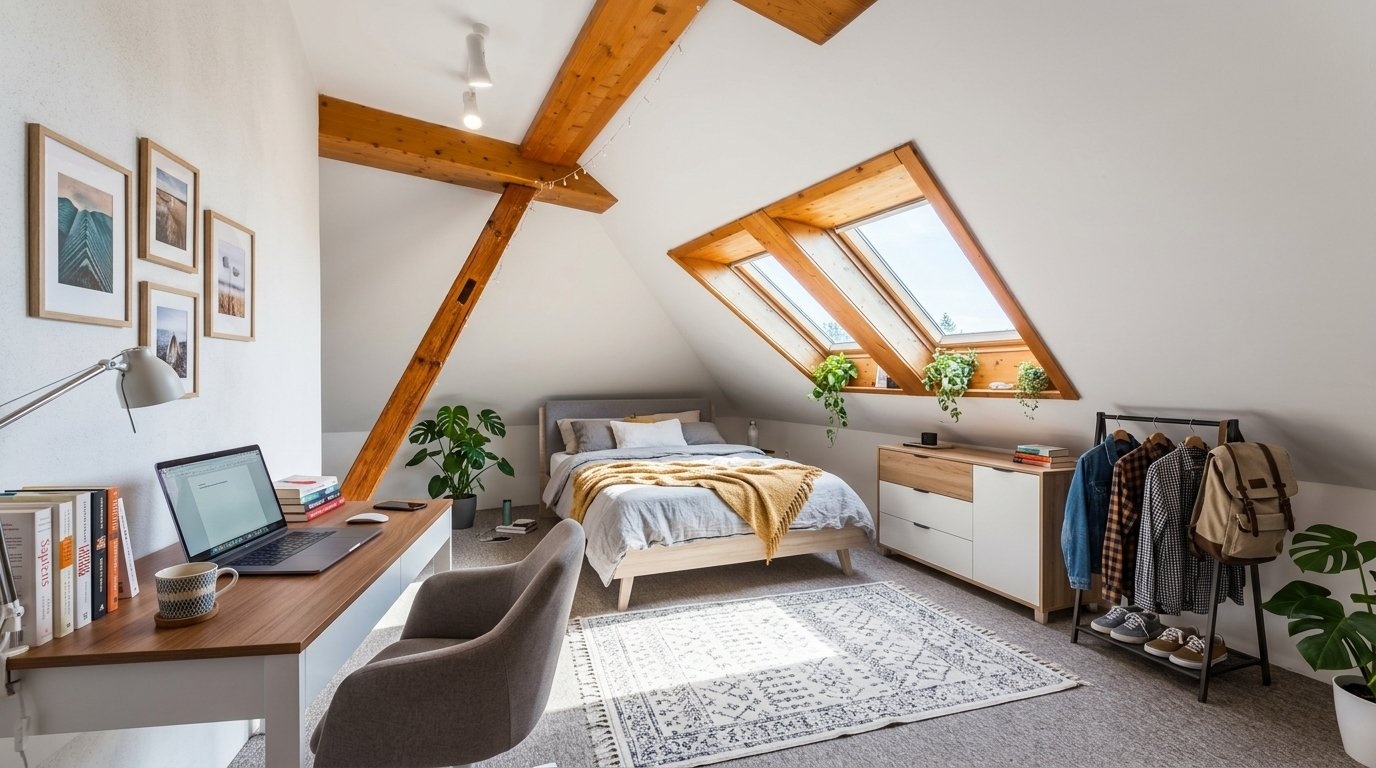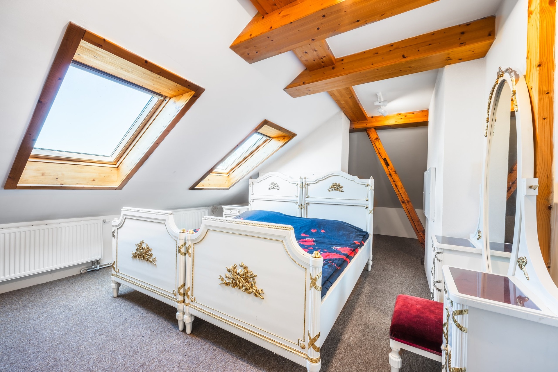 V podkroví najdete dva samostatné pokoje, ideální třeba jako ložnice a dětský pokoj nebo pracovna.