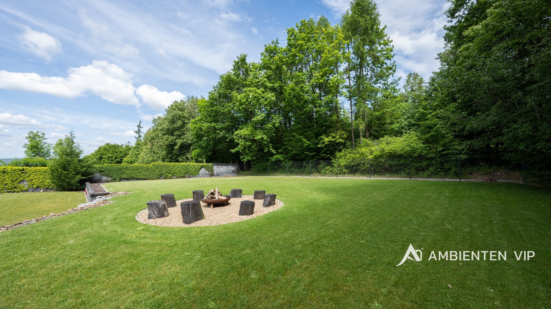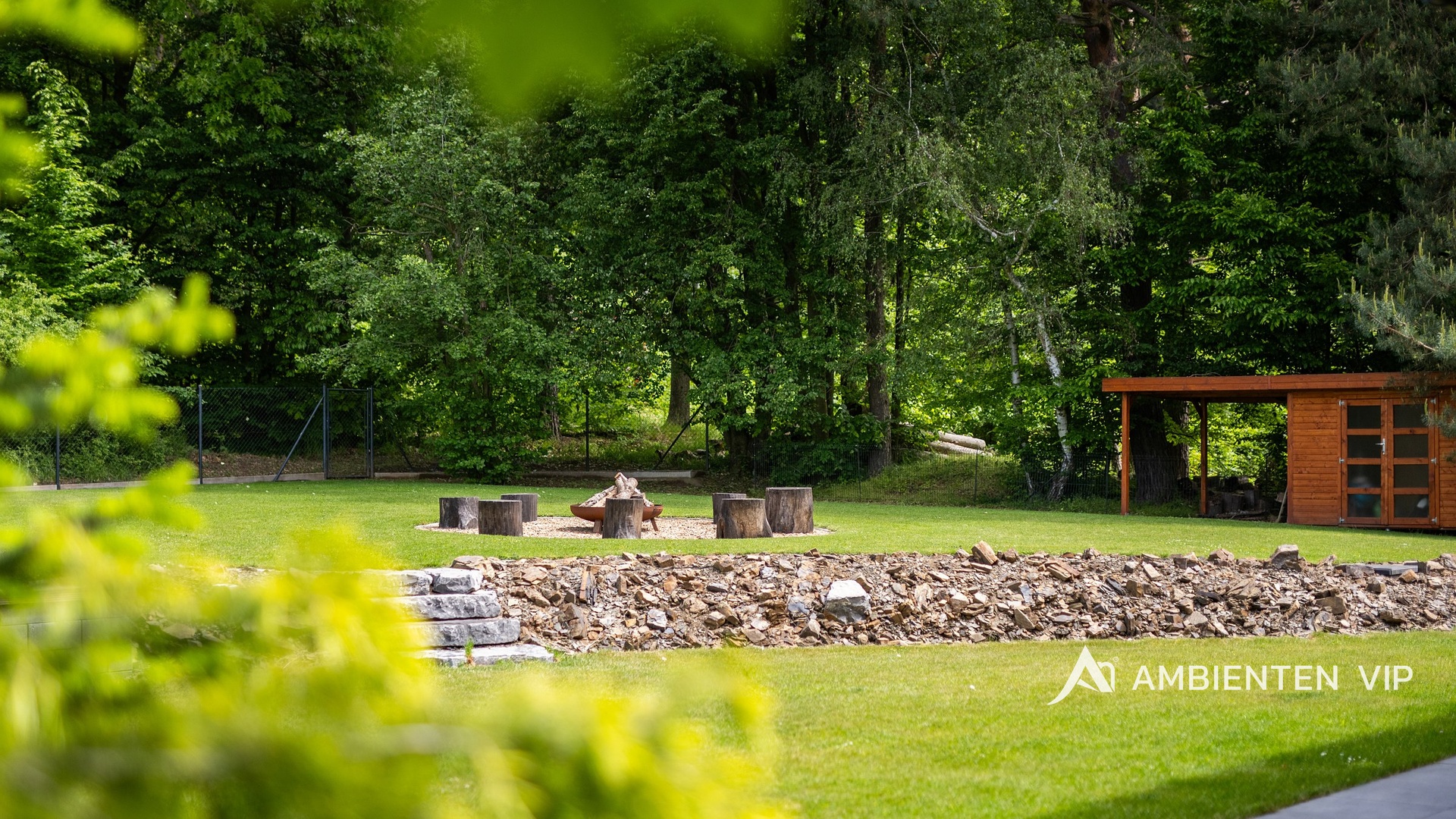 Dům se nachází v bezprostřední blízkosti lesa, na konci slepé ulice v nové zástavbě, bez možnosti navazující okolní výstavby. Součástí prodeje nemovitosti je totiž přímo navazující zahrada o výměře 2469m2, na které se nachází i rekreační objekt, určený k rekonstrukci s možností připojení na všechny sítě (zpracována studie na celoročně obyvatelnou chatu). Tímto je zaručeno maximální soukromí, pohoda a klid prodávaného rodinného domu.