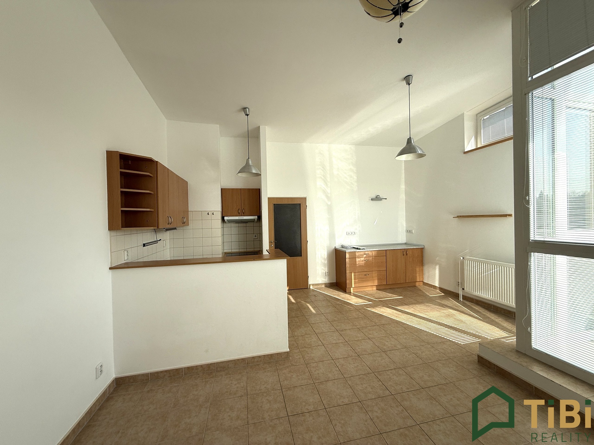 Dominantu bytu tvoří prostorný obývací pokoj s kuchyňským koutem, linkou, jenž je vybavena spotřebiči Elektrolux.