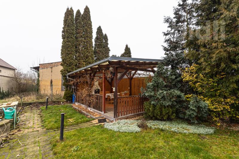 Na pozemku najdete krásnou pergolu s krbem, která poskytuje příjemné venkovní posezení.