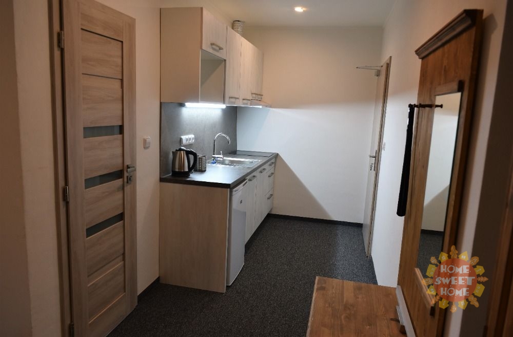 Apartmán číslo 8 o rozloze 23,5m2 se skládá z jedné velké místnosti včetně kuchyňské linky a koupelny.