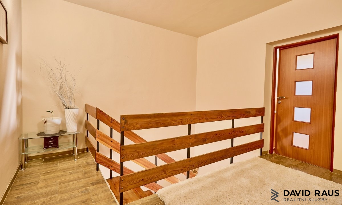 Schodištěm se dostanete do druhého podlaží, kde jsou čtyři obytné místnosti (18,4 m², 10,30m², 17,10m², 11,40 m²) a koupelna s WC (6,10m²). V jedné z místností je výklenek určený pro kuchyňský kout, což umožňuje nemovitost přebudovat na dvougenerační bydlení.