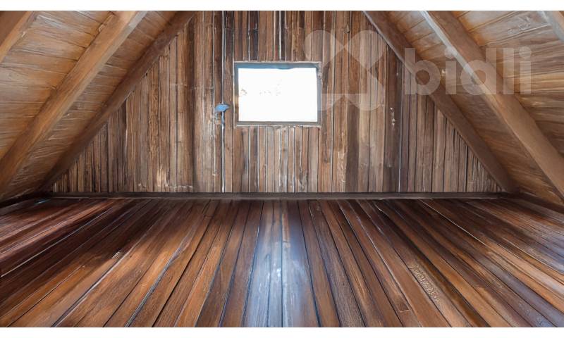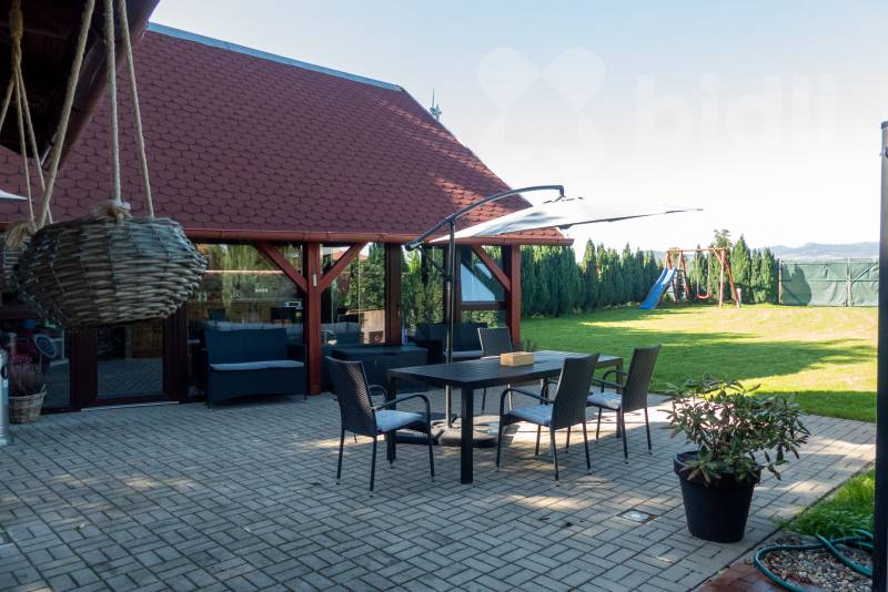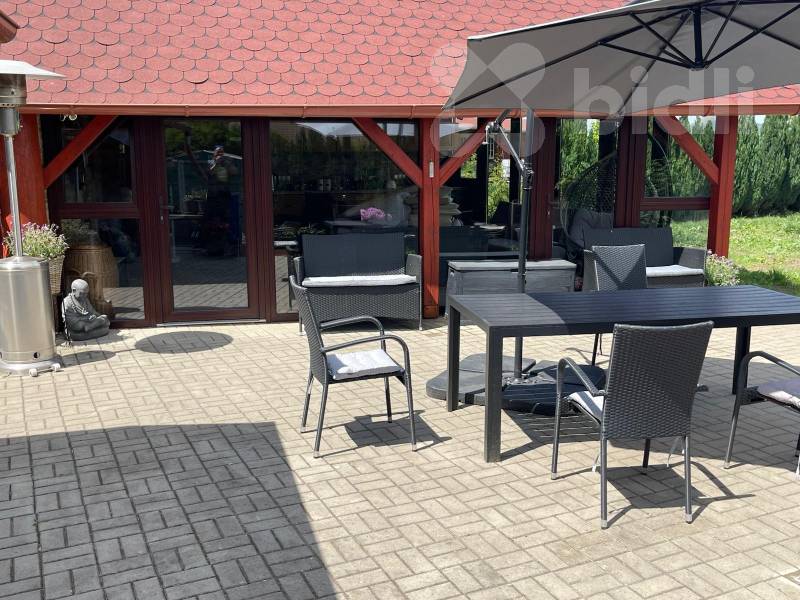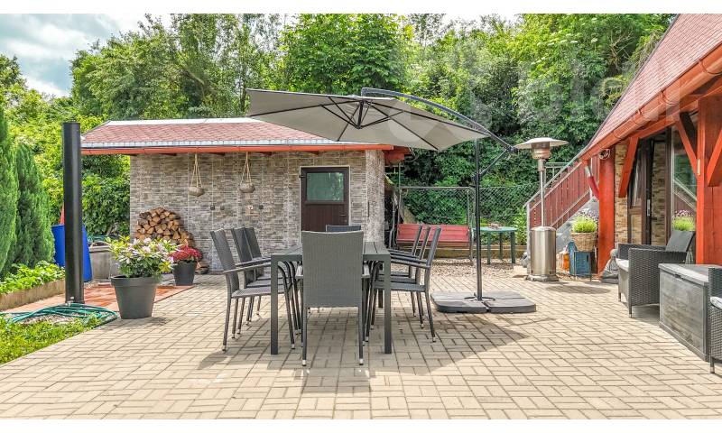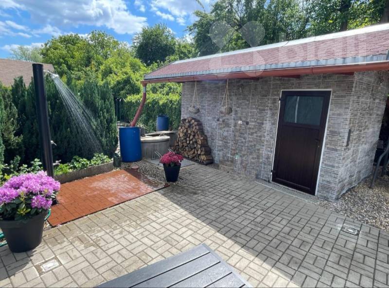 Součástí pozemku je chata o rozměrech 7 × 6 metrů. Stavba je částečně zděná, druhou polovinu tvoří prosklená konstrukce z oken a dveří, která přirozeně propojuje interiér s exteriérem a dodává prostoru dostatek světla. Před chatou se nachází terasa, ideální pro posezení s výhledem do zahrady.