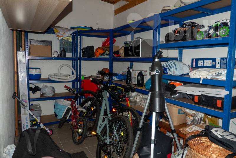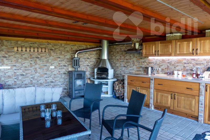 V přízemí je moderně zařízená kuchyně s výhledem na zeleň, dizpozice, plotýnka, vestavěná lednice, kamna, mikrovlná trouba. Chata je napojena na elektřinu i vodu a připravená pro vytápění krbovými kamny, což umožňuje komfortní využití i mimo letní sezónu.