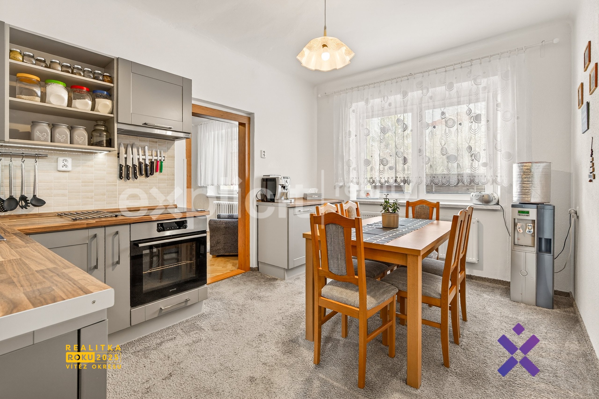 Další místností je kuchyň, která je vybavena kuchyňskou linkou s vestavnou troubou, varnou deskou a myčkou. Na kuchyň plynule navazuje obývací pokoj, čímž vzniká příjemný prostor pro každodenní život i setkávání s rodinou či přáteli. Kuchyňská linka včetně spotřebičů zůstává součástí prodeje, ostatní vybavení domu nebude zahrnuto, což dává novému majiteli možnost upravit si interiér zcela podle vlastních představ.