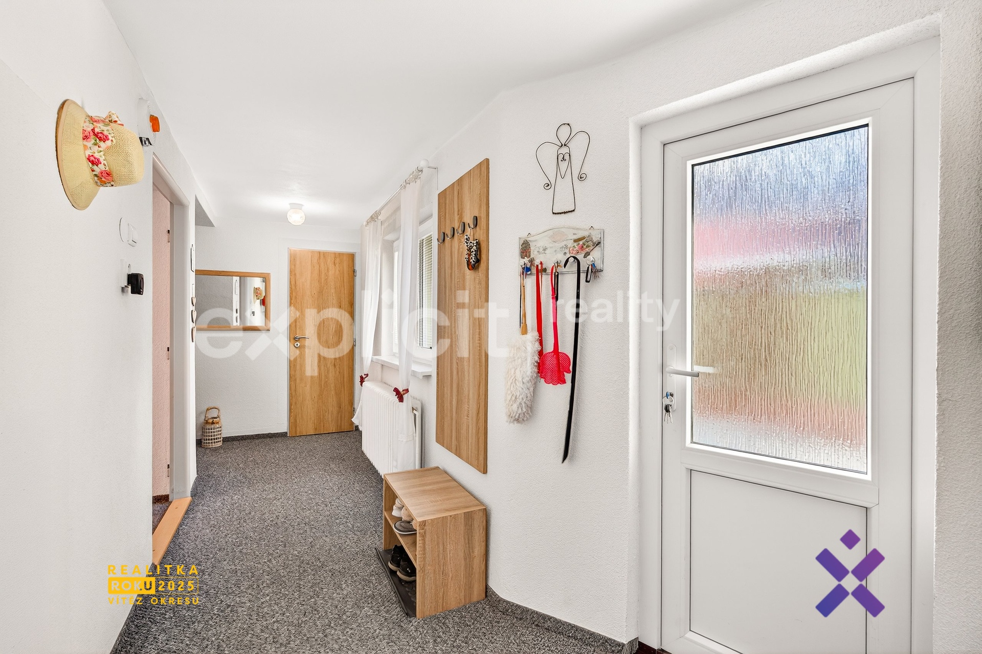 Po vstupu do domu se dostanete do prostorné chodby ve tvaru L, ze které je přístup do všech místností. Díky oknu je chodba příjemně prosvětlená.