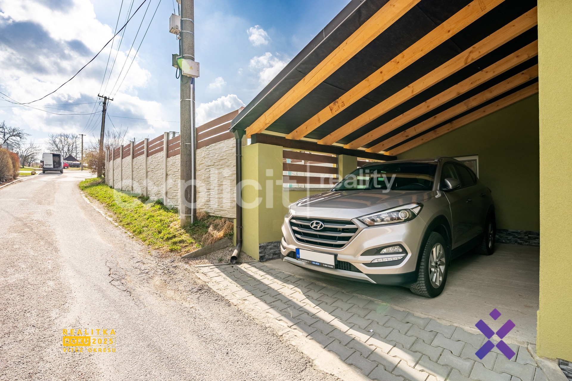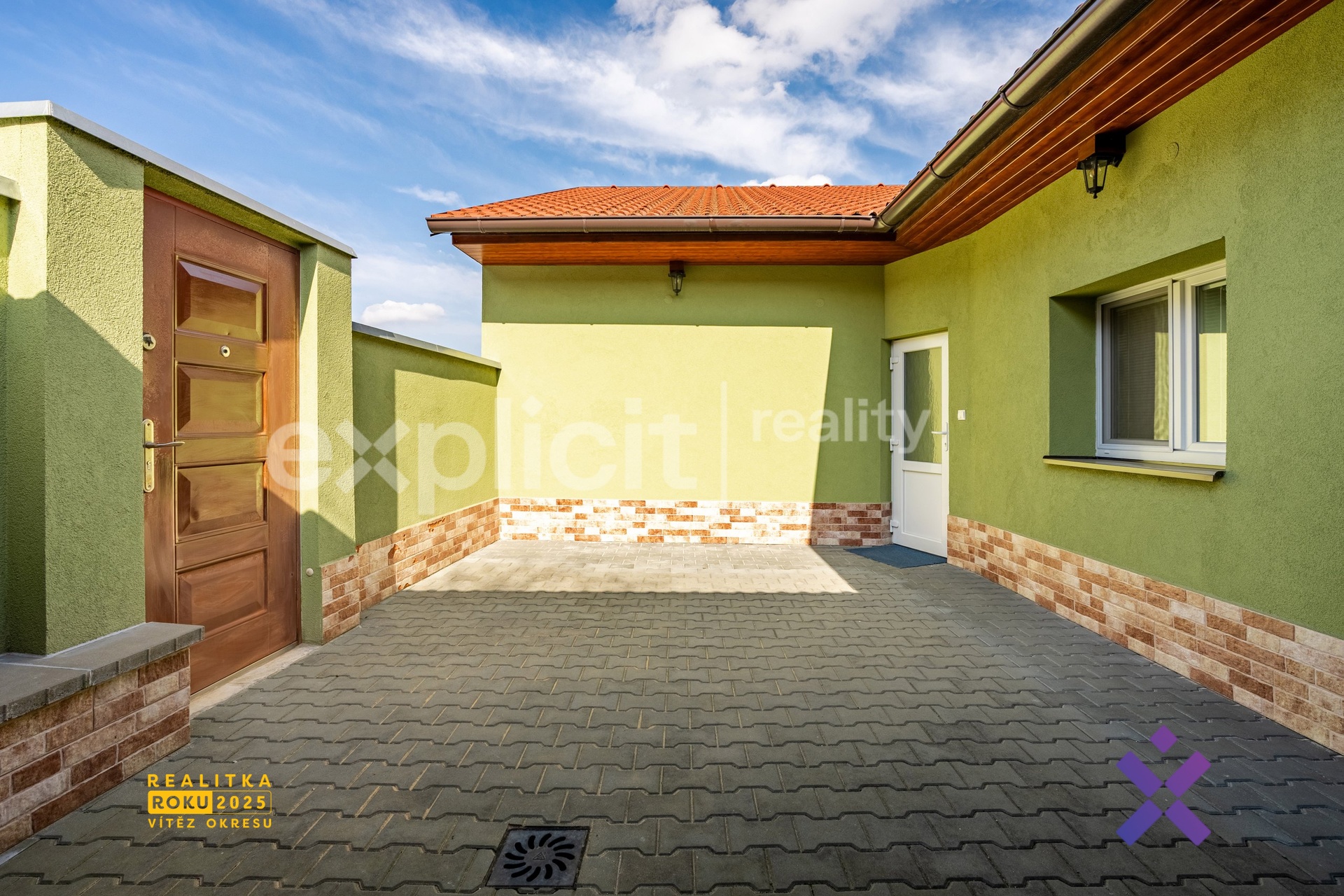 Z chodby domu se dále dostanete na dlážděný dvorek s přístřeškem, který nabízí příjemné zázemí pro posezení nebo praktické využití během celého roku. Z tohoto dvorku je následně vstup na zahradu.