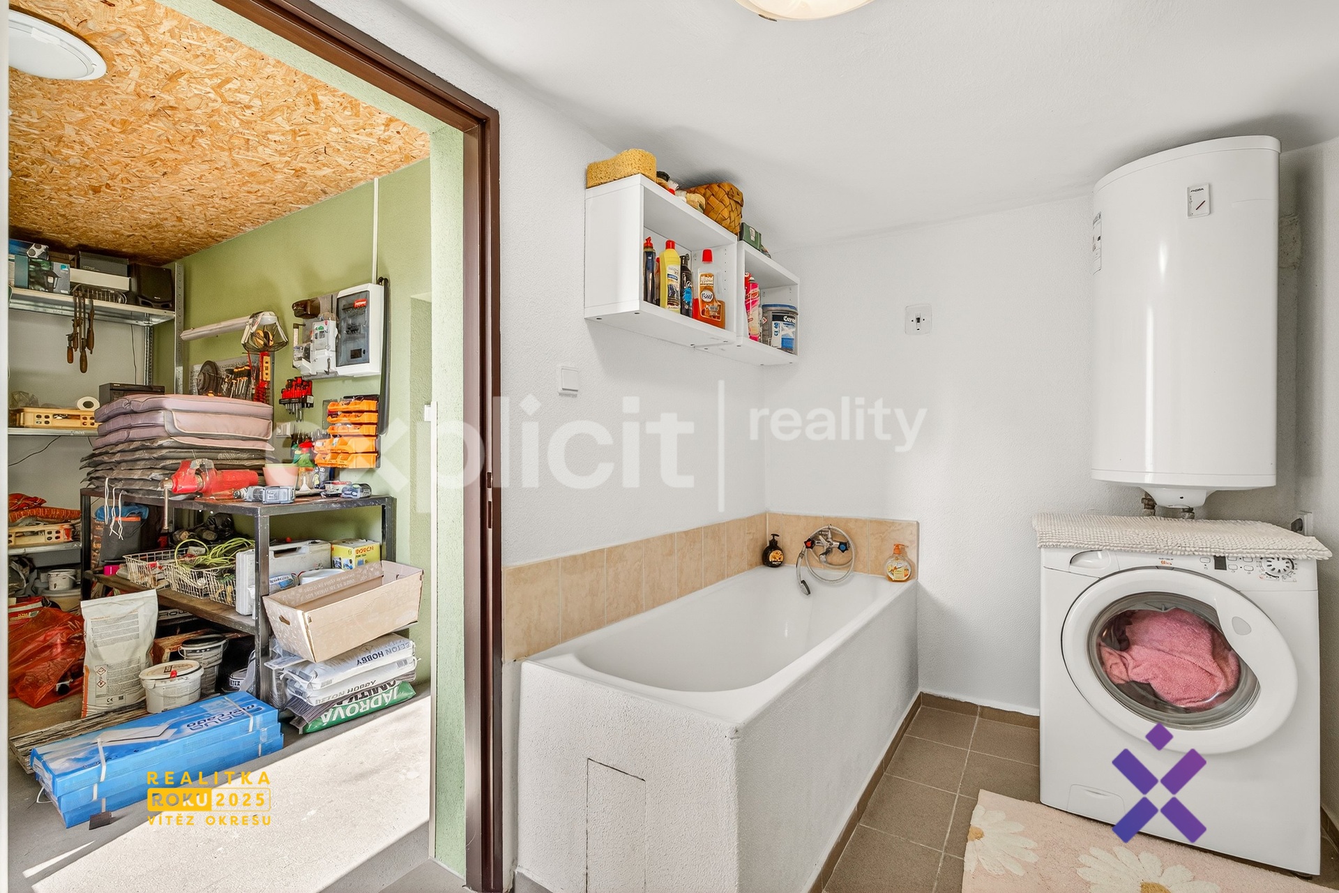 Přechod na zahradu vede přes přístavbu, kde se nachází dílna s elektroměrem a naproti ní prádelna se sušárnou. V této místnosti je umístěna pračka, vana, bojler a WC.