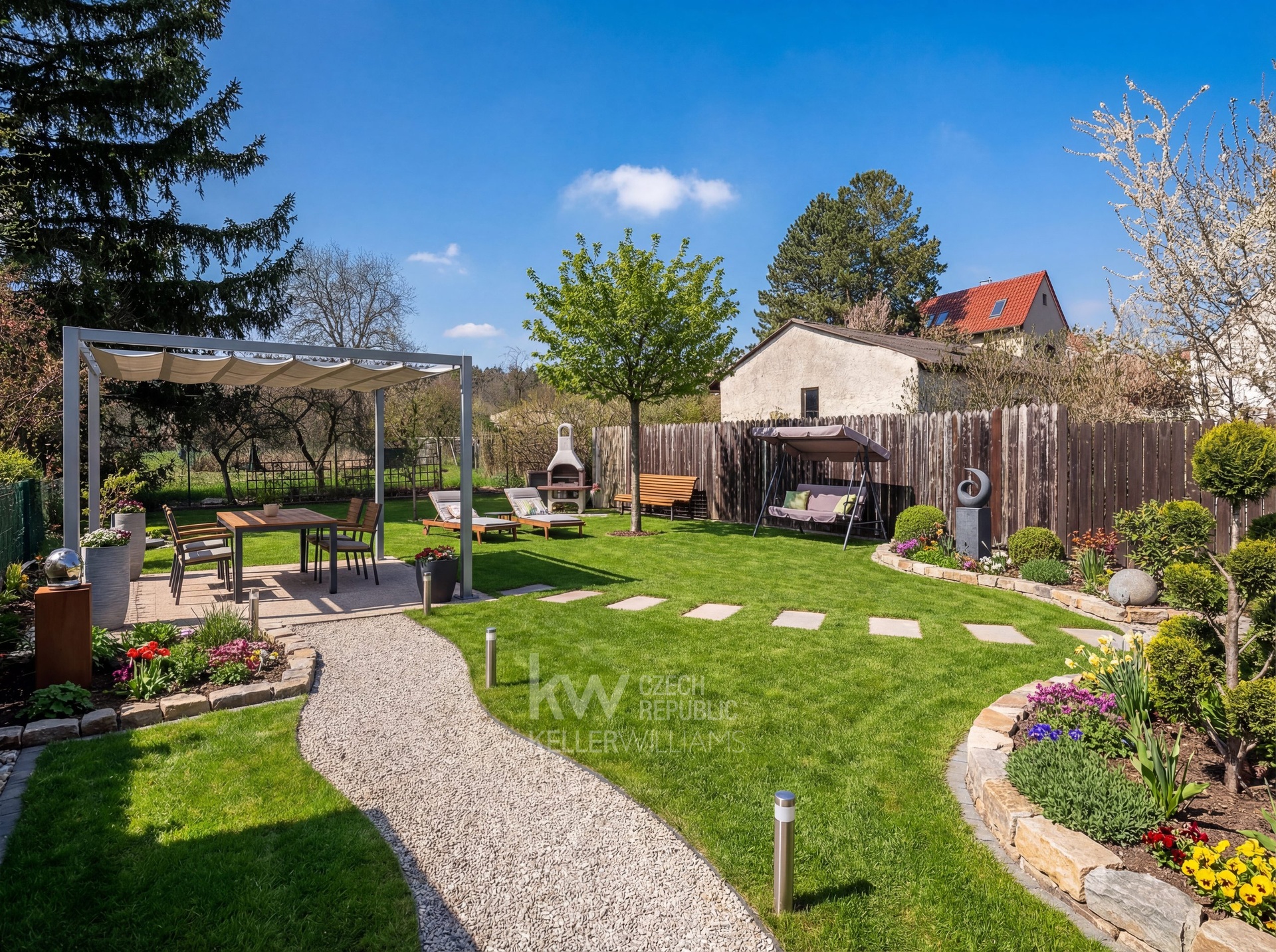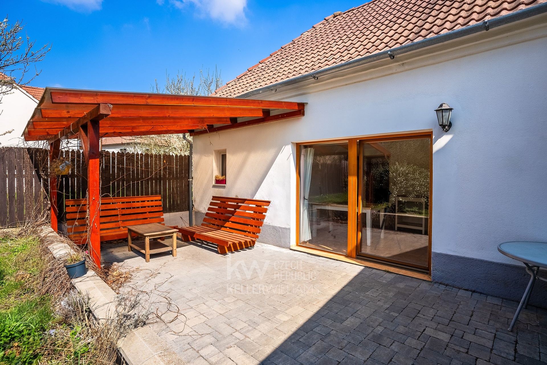 Součástí domu je menší, celodenně slunná zahrada, která poskytuje dostatek prostoru pro vyžití dětí nebo odpočinek na čerstvém vzduchu. Její součástí je terasa, na kterou je vstup francouzskými okny z kuchyně.