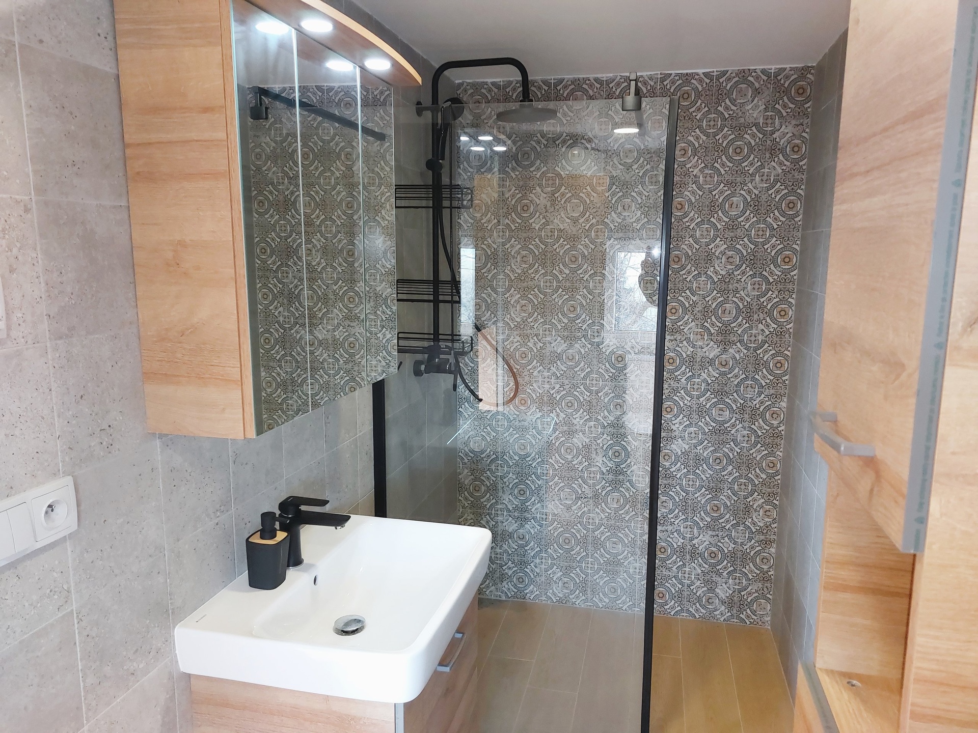 Moderní koupelna s kvalitními španělskými obklady je spojena s WC a vybavena sprchovým koutem, elektrickým bojlerem pro ohřev teplé vody, podlahovým vytápěním i žebříkovým radiátorem, takže zajistí maximální komfort. Je zde i příprava na pračku.