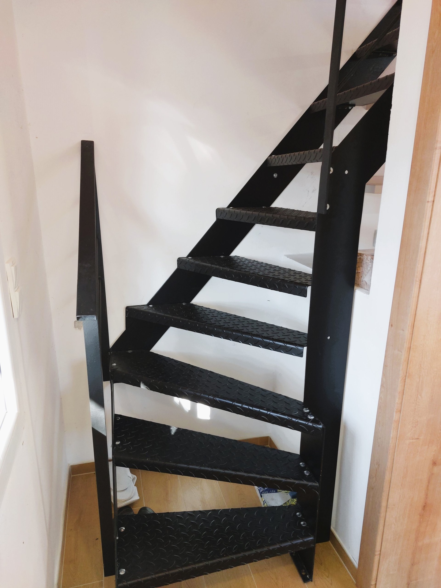 Do ložnici v patře vede působivé kovové schodiště. Všechna okna jsou plastová.
