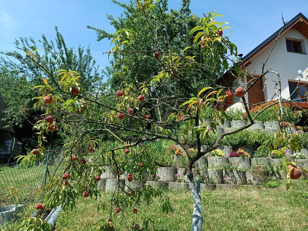 Zahrada s ovocnými stromy poskytuje dostatek soukromí i možnost zahradničení.