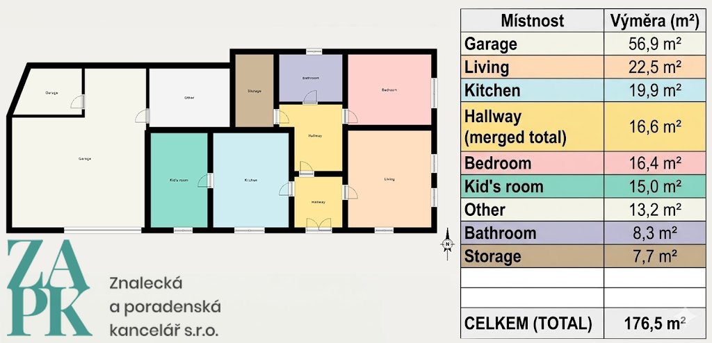 - Celková podlahová plocha: cca 176,5 m² (bez půdy a skladu)