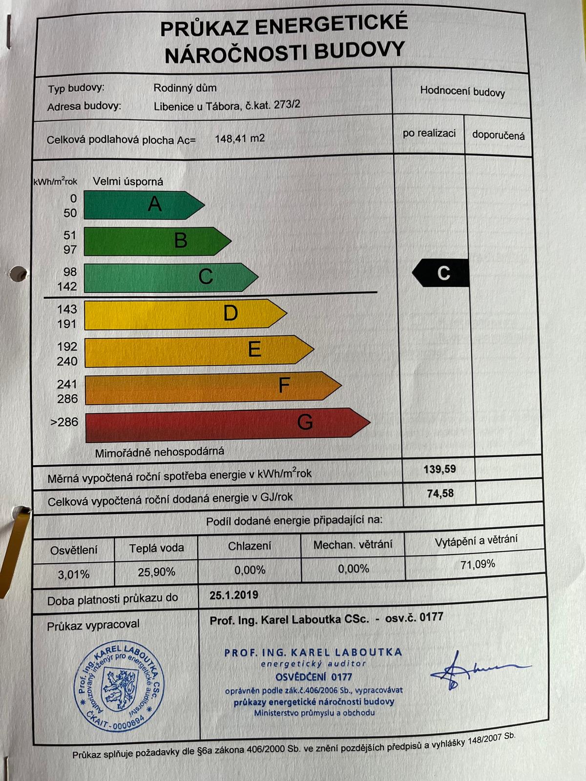 Dispozice domu: vstupní chodba 6,6 m2, obývací pokoj s kuchyní 37 m2, ložnice 12 m2, koupelna 7,2 m2, WC 2,5 m2, pokoj 14 m2, terasa 15 m2, kotelna 9,2 m2, spíž 3,3 m2, šatna 5,1 m2, komora 4 m2, půdní prostor 200 m2.