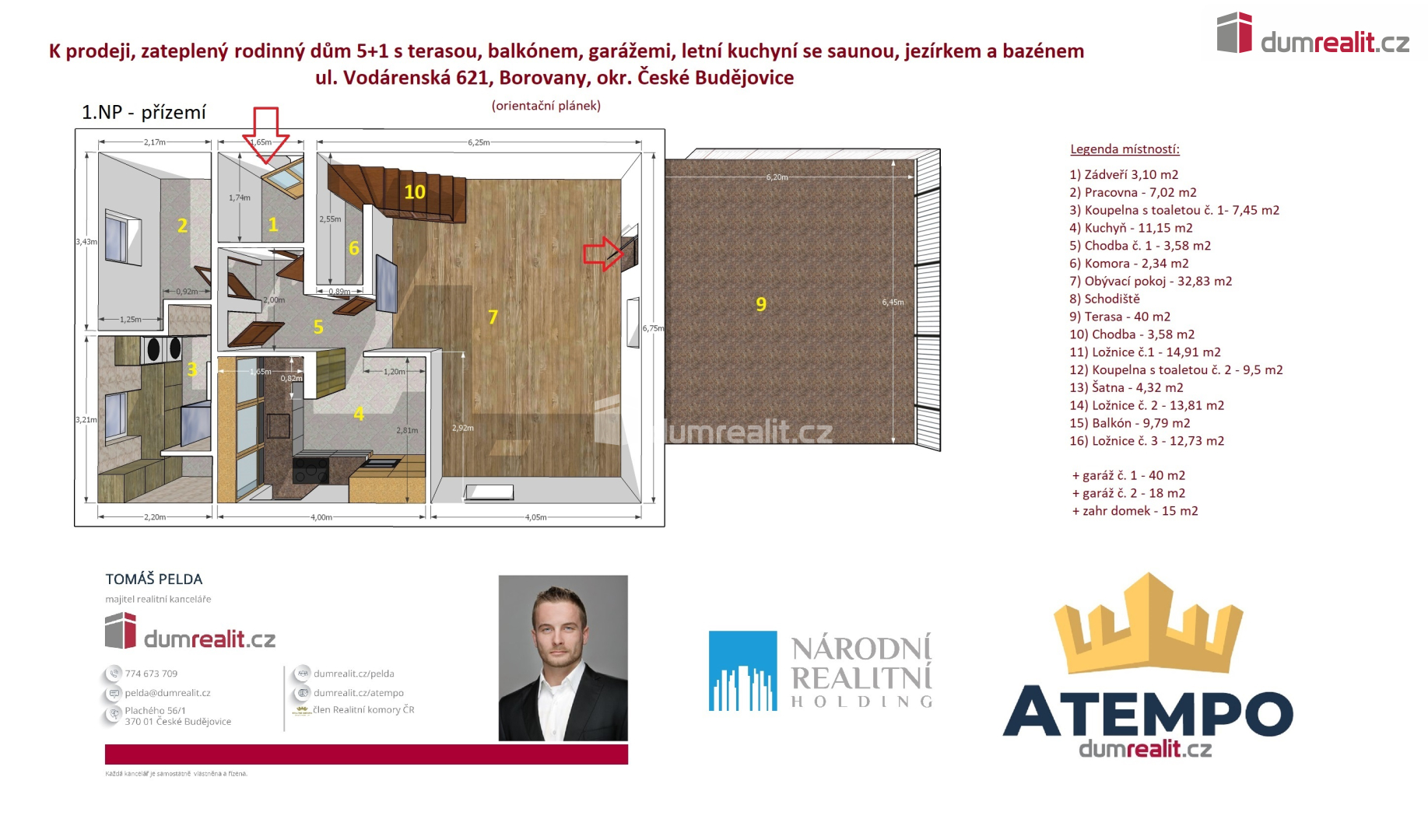 Naše společnost Vám zprostředkuje prodej zatepleného zděného rodinného domu 5+1 s novou kuchyňskou linkou, 2 koupelnami, pracovnou, velkou terasou, balkónem, dvěma garážemi, jezírkem, bazénem a letní kuchyní se saunou v absolutním soukromím ve městě Borovany, ul. Vodárenská č.p. 621. Prodávaný dům s pozemkem naleznete na LV č. 2068 zapsané v kú Borovany. Podrobné rozkreslení jednotlivých podlaží naleznete na orientačních pláncích mezi fotografiemi. Krásná udržovaná zahrada o výměře 1504 m² se vzrostlým živým plotem poskytuje dostatek soukromí, prostoru pro bazén s moderním automatickým pojezdovým zastřešením a jezírko pro zachytávání dešťové vody. Na pozemku je také montovaná garáž, spojená se zahradním domkem s letní kuchyní a saunou. Objekt je připojen na plyn, elektřinu, veřejný vodovod a městskou kanalizaci. Topení a ohřev vody je plynovým kotlem. V domě se také nachází dvě klimatizační jednotky (obývací pokoj, ložnice č.1 dle orientačního plánku). Náklady na vytápění domu a ohřev vody po vyúčtování z roku 5-2024/5-2025 činí 3.500,-Kč měsíčně. Více informací Vám poskytne realitní makléř Tomáš Pelda z realitní kanceláře A TEMPO fungující pod ochrannou známkou naše společnost. Zajistíme Vám financování a veškerý právní servis. Ev. číslo: 652412.