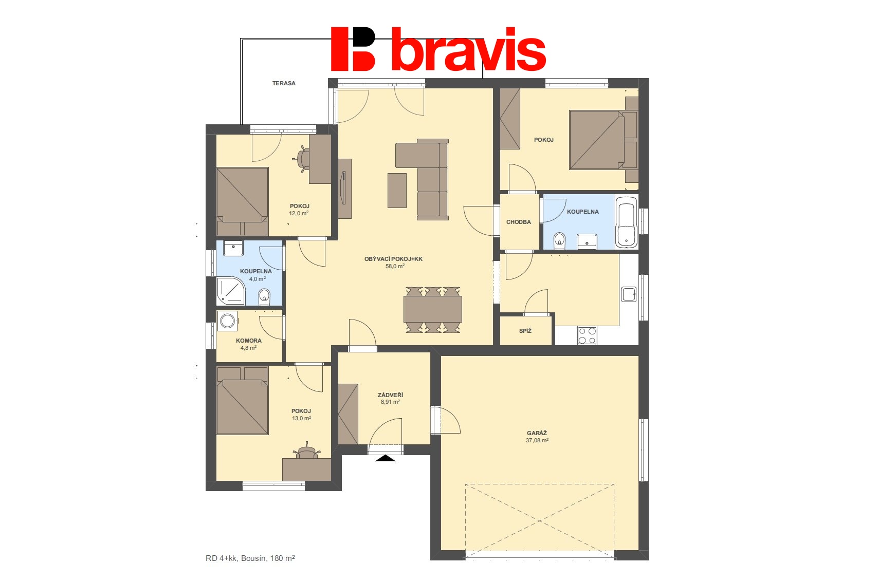 Celková užitná plocha domu činí přibližně 180 m² včetně dvojgaráže.