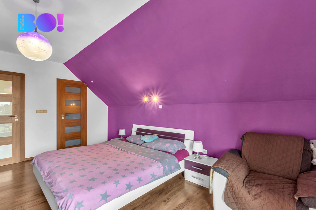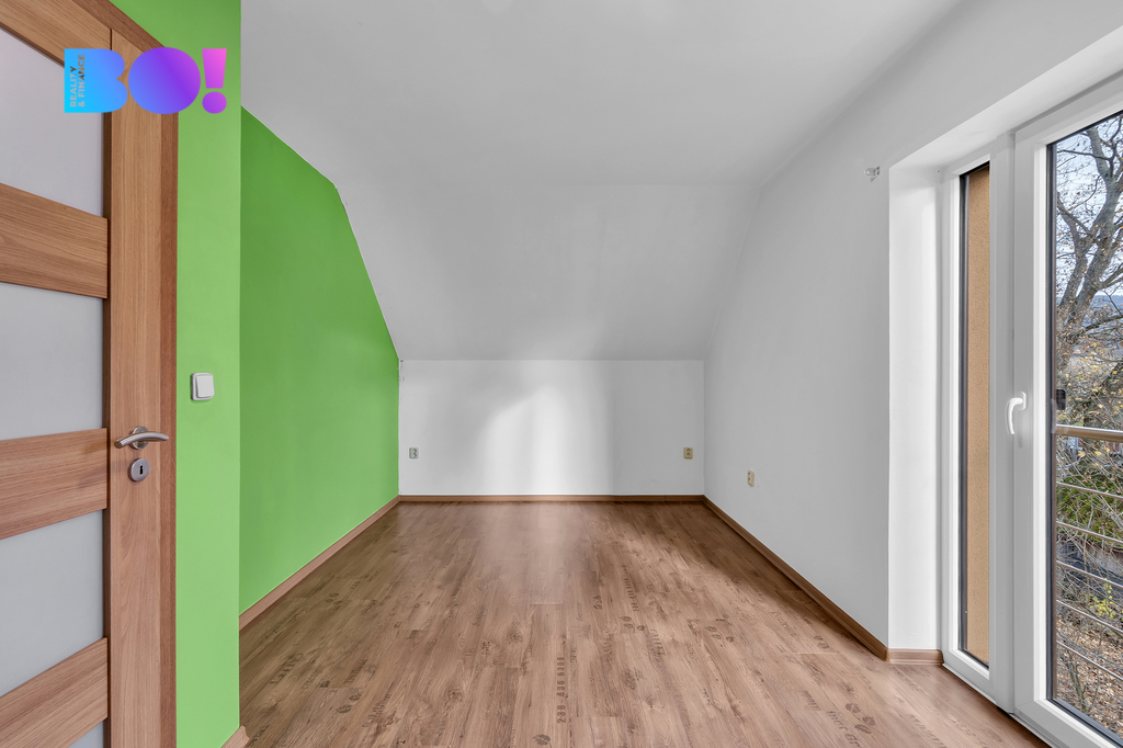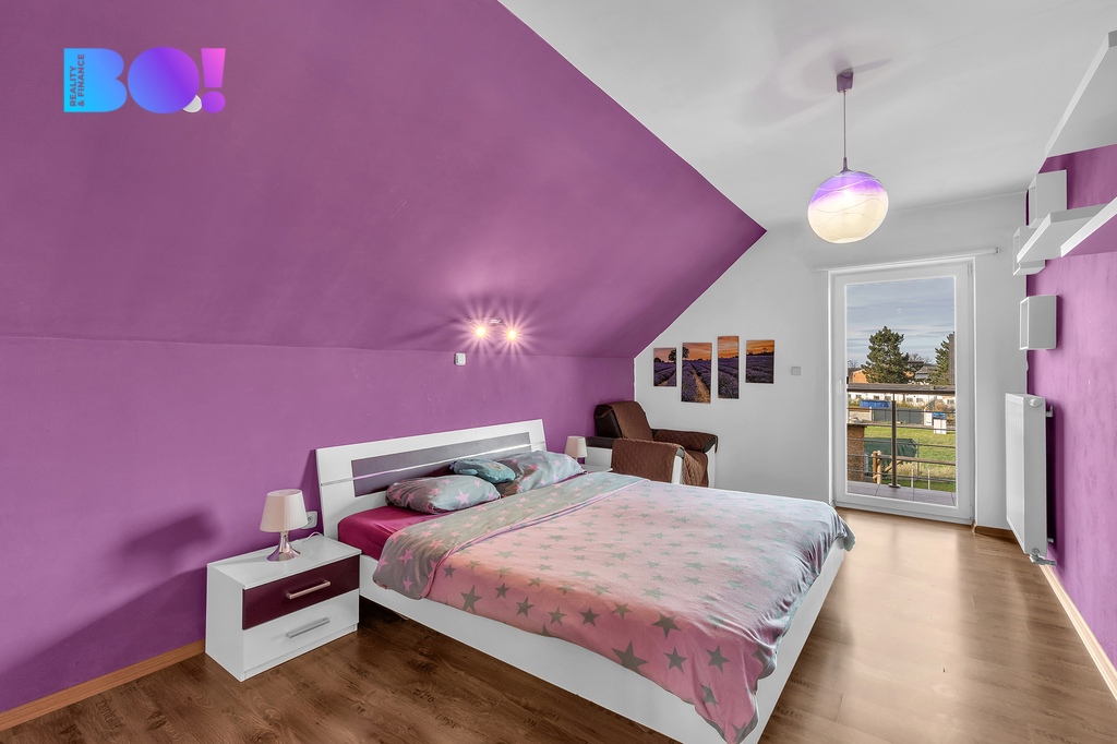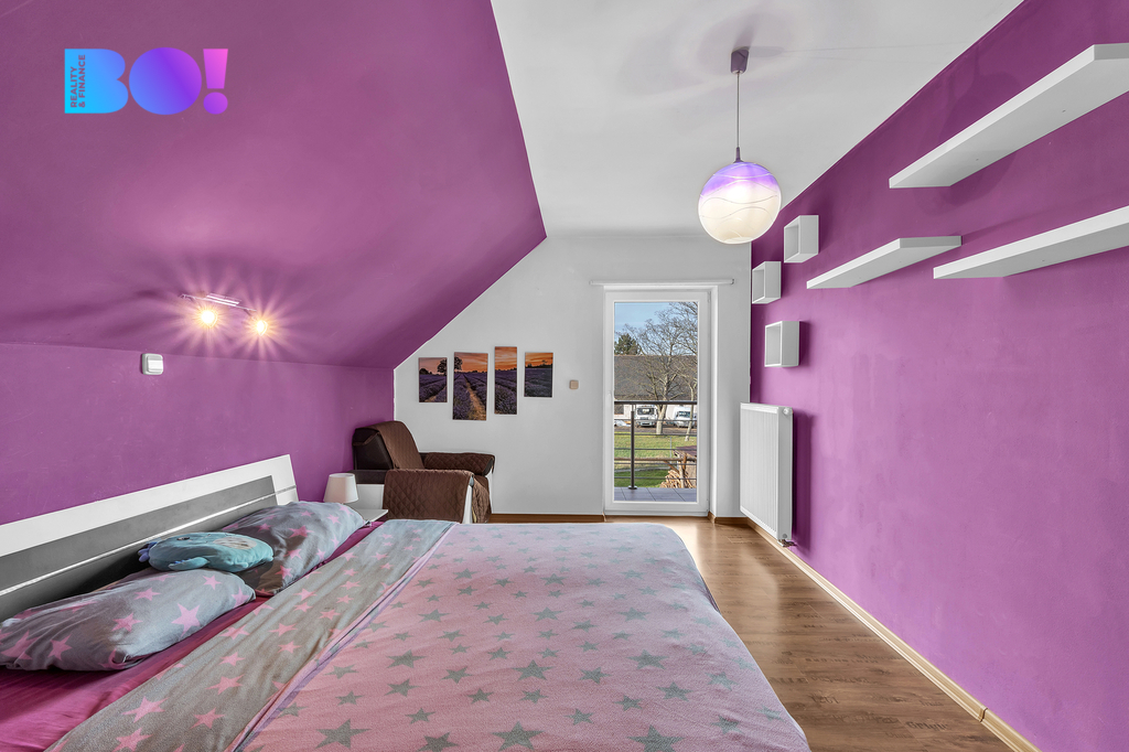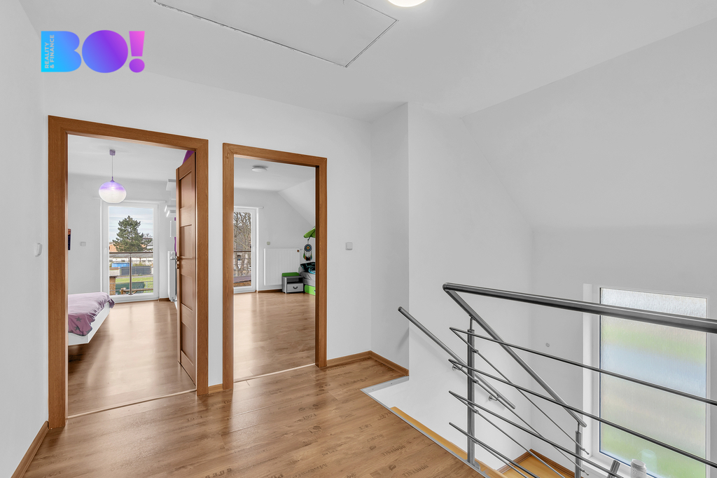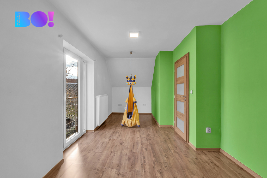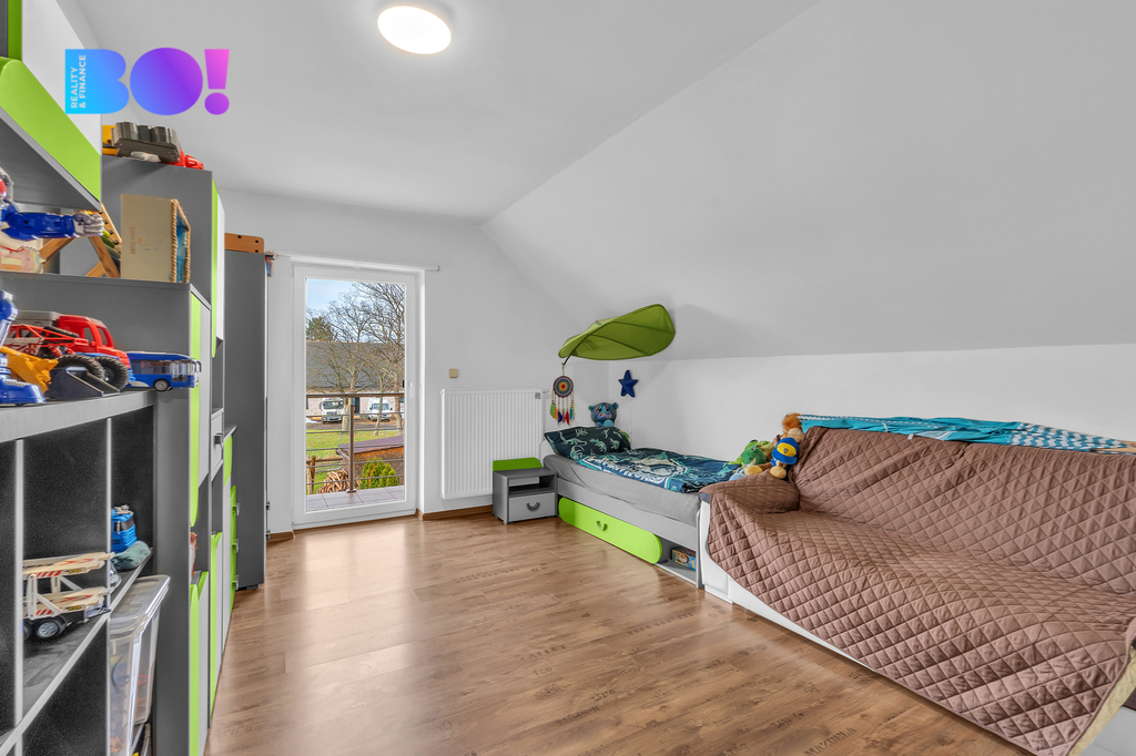 • Patro: ložnice s šatnou a vstupem na balkon, 2x dětský pokoj, WC.