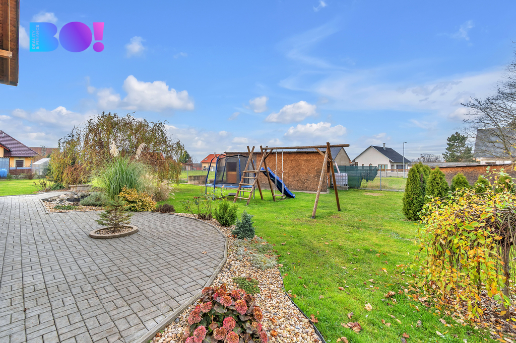 Na rodinný dům navazuje terasa pro grilování a odpočinek, zahrada o ploše 1125 m² s bazénem.