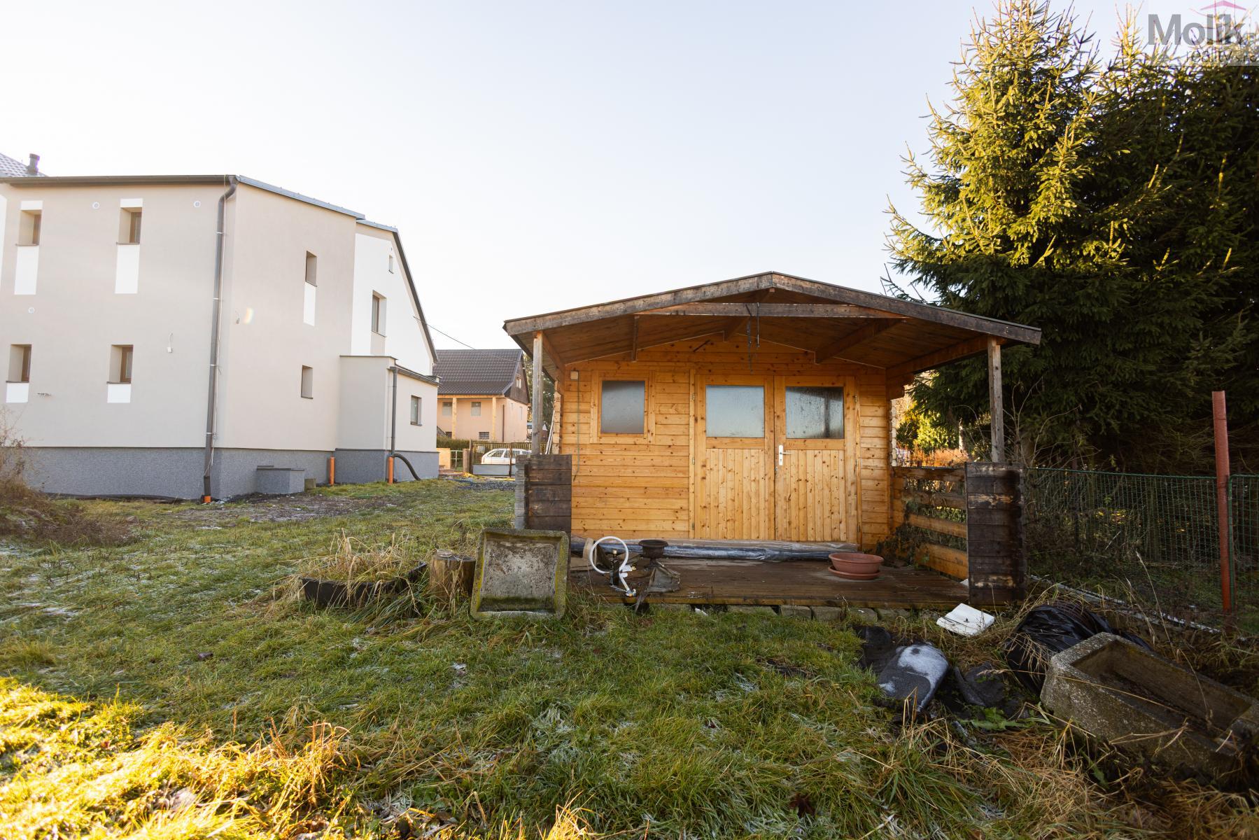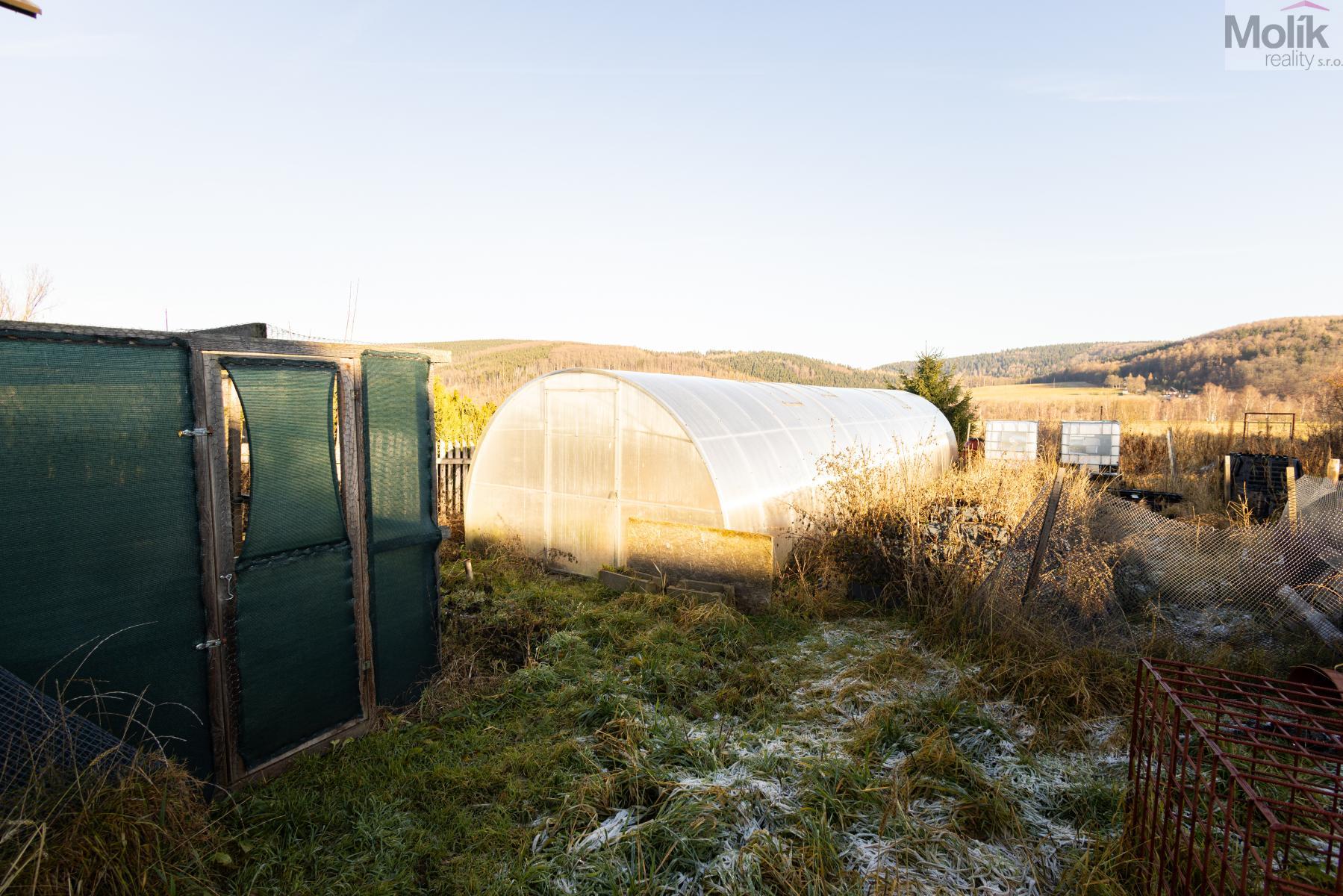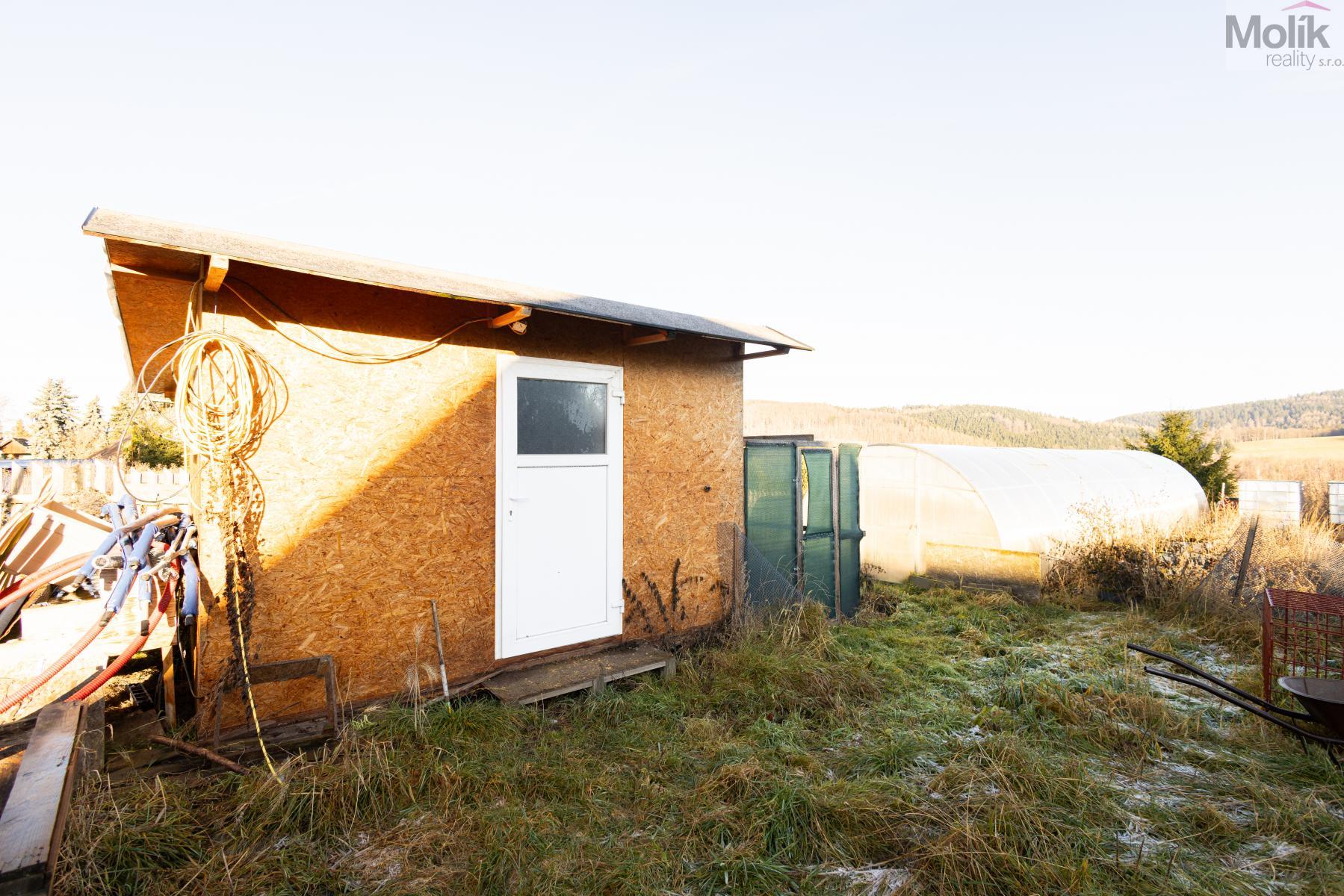 Na zahradě se nachází zahradní domek s možností připojení elektřiny,dále kurník a prostorný skleník. Zahrada nabízí realizaci zahradního jezírka. Z druhé strany domu, je příprava na terasu s vířivkou.
