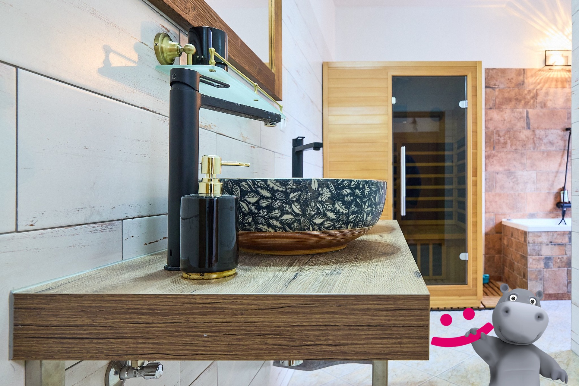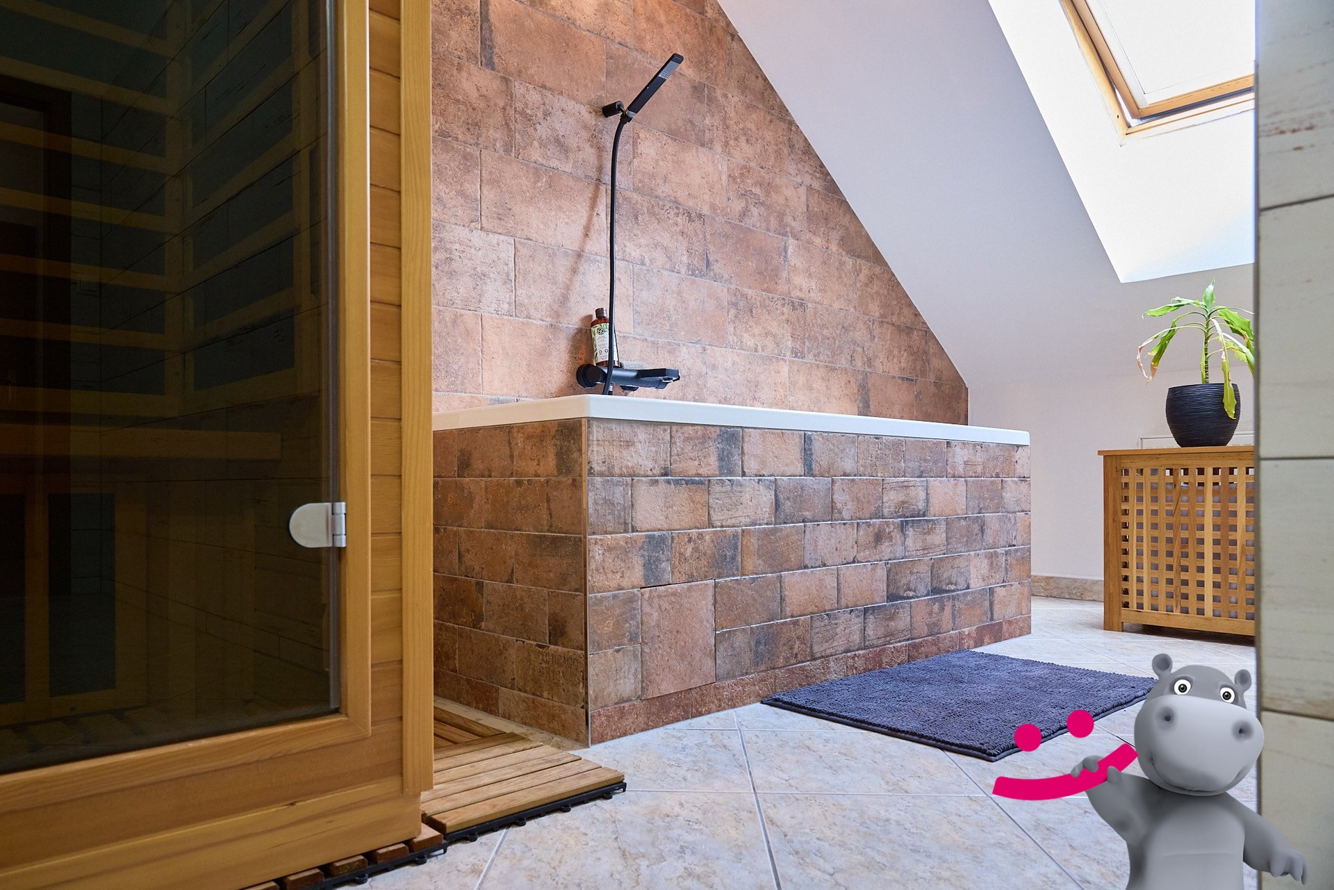 V přízemí bytu se nachází obývací pokoj propojený s kuchyní a jídelním koutem, komora, vstupní chodba a schodiště. V patře jsou dva samostatné velmi prostorné obytné pokoje, které nabízejí dostatek místa pro pohodlné bydlení. Dále je zde koupelna, která má moderní design s kvalitní sanitou (vana, dvě umyvadla, sauna, kotel, prostor na pračku a sušičku). Na centrální horní chodbě je také prostorná samostatná toaleta.