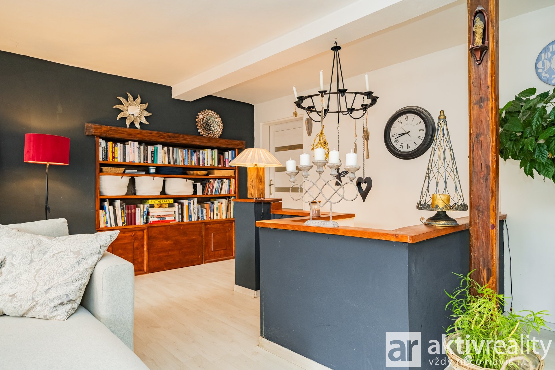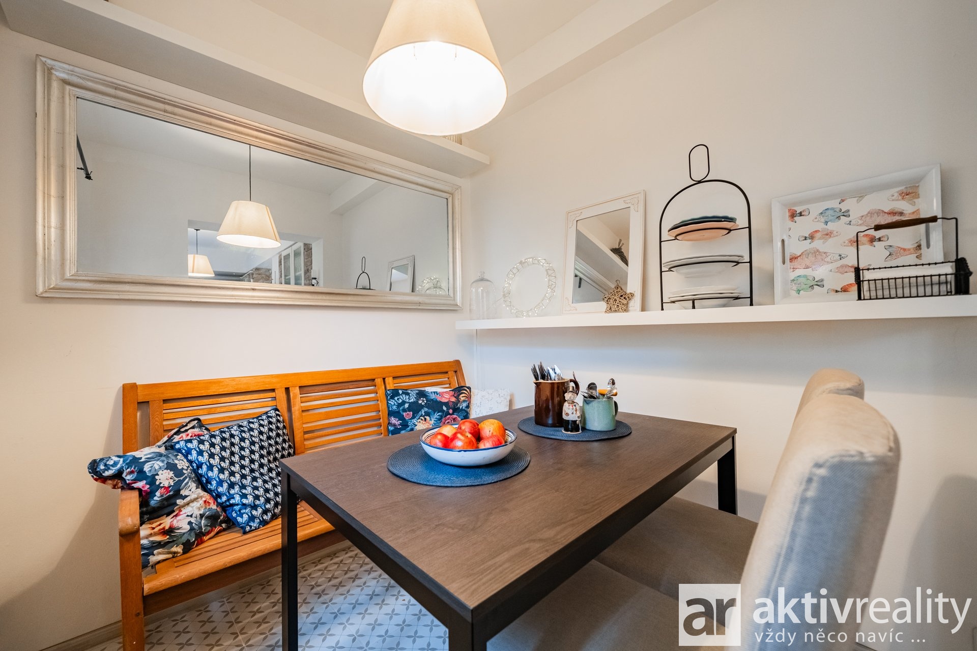 Obytná část domu o dispozici 2+1 nabízí možnost pohodlného bydlení nebo dalšího pronájmu s ročním výnosem 240 000,- Kč. V přízemí se nachází vstupní chodba, technická místnost s místem pro pračku a sušičku, špajz a kuchyně s jídelnou s výhledem do dvora. Po dřevěném schodišti vystoupáte do patra, kde je prostorný obývací pokoj s krbovými kamny, ložnice a koupelna se sprchovým koutem i vanou (aktuálně v rekonstrukci).