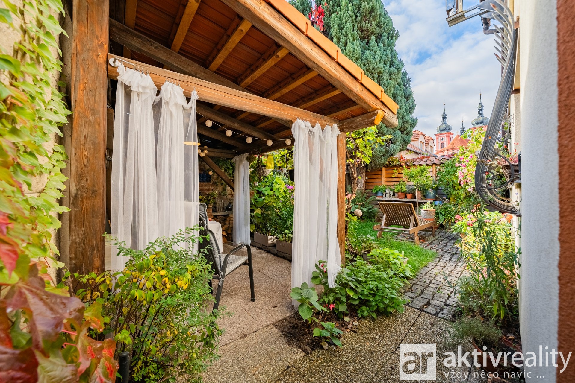 Za domem se nachází uzavřený dvorek se zahrádkou, terasou a studnou, ideální pro relaxaci a klidné posezení. Z terasy se otevírá jedinečný výhled na kostel Nanebevzetí Panny Marie, který dotváří kouzelnou atmosféru celého místa.