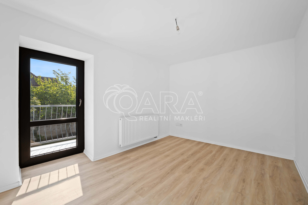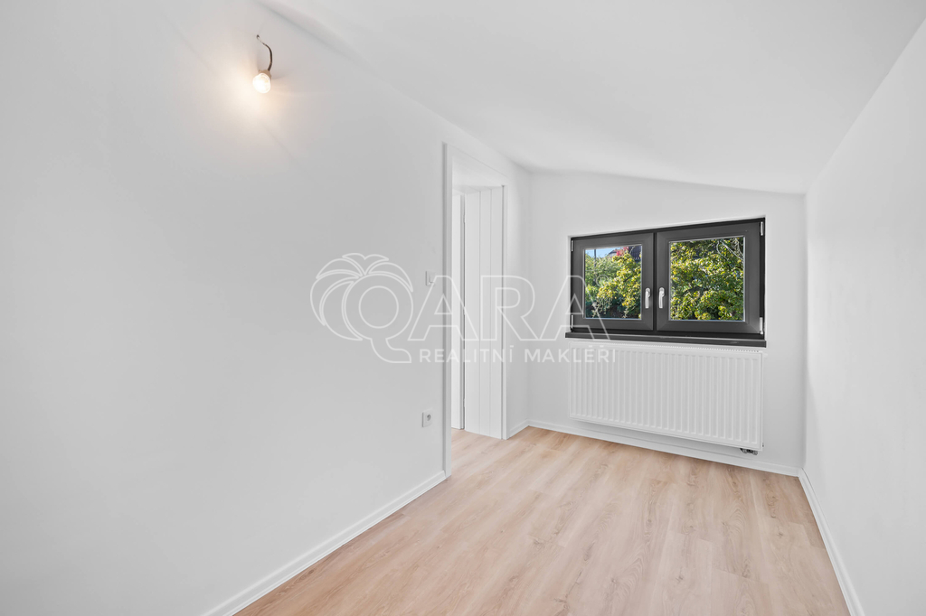 V patře jsou tři samostatné pokoje, z nichž dva mají vlastní šatnu a jeden přístup na balkon a dále samostatná koupelna s vanou a WC.