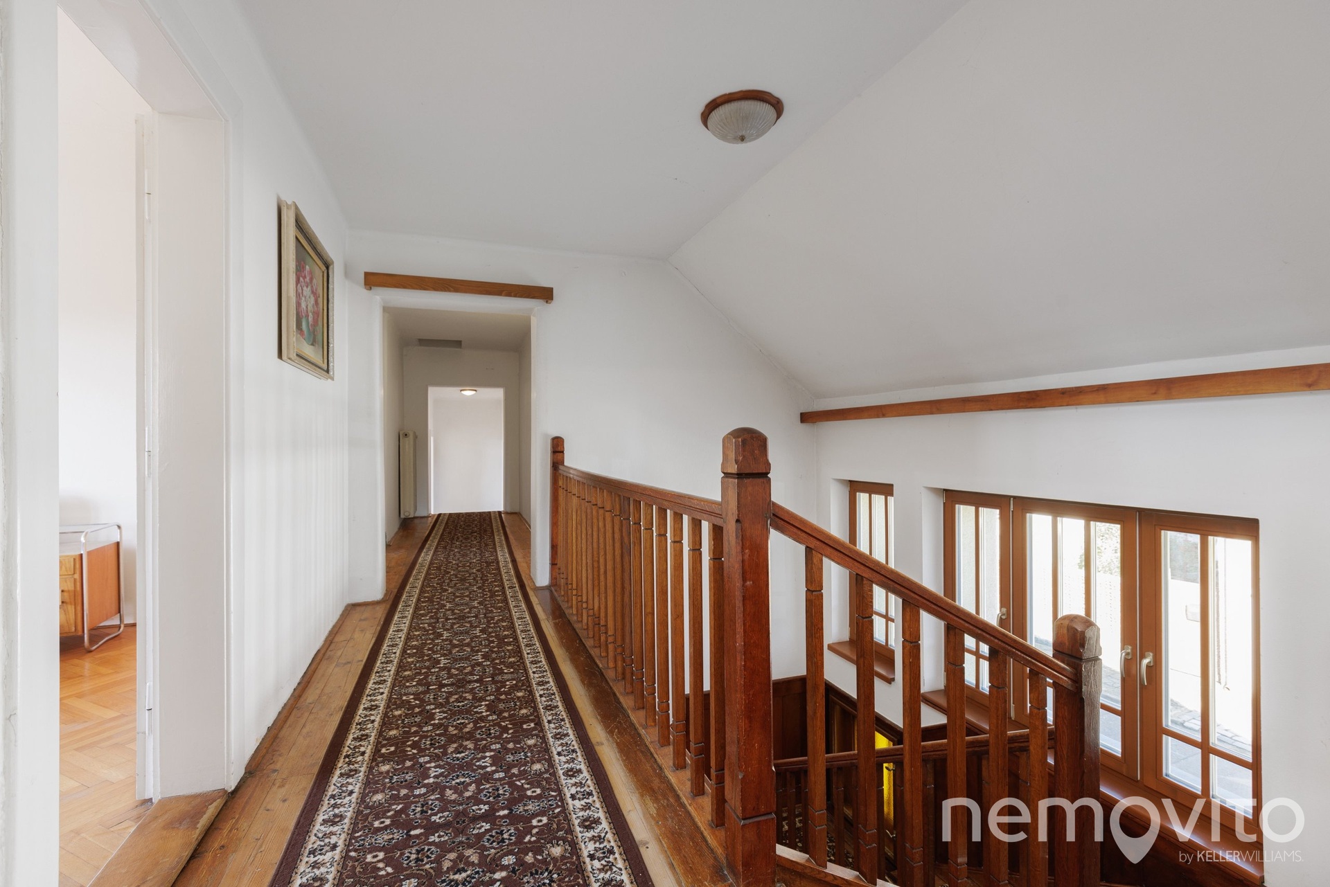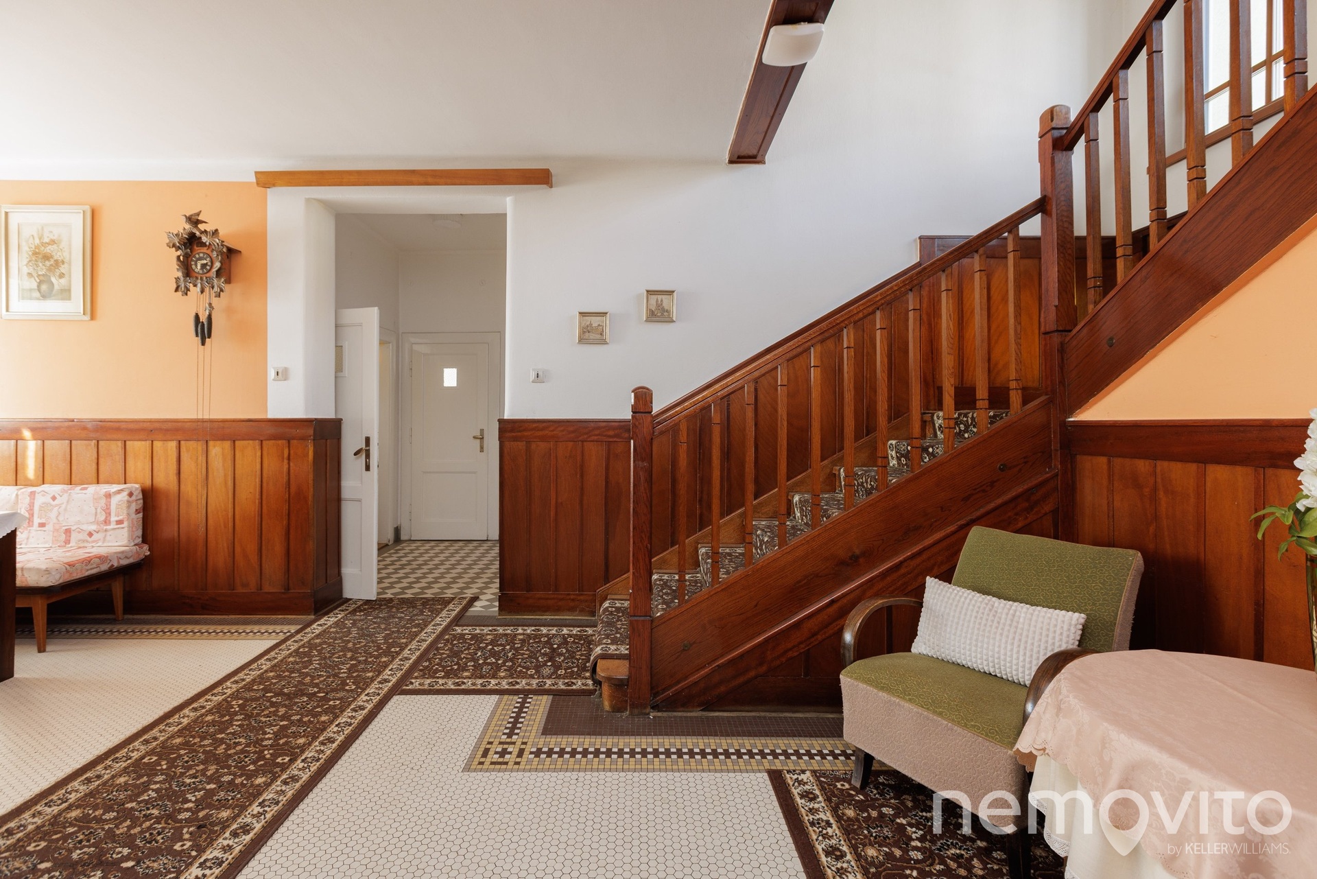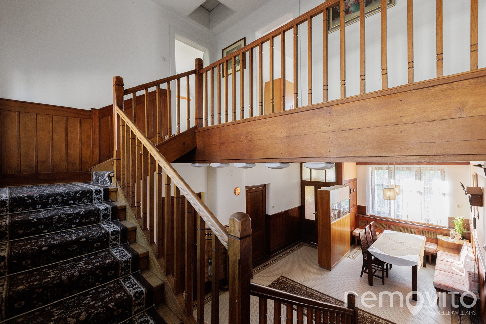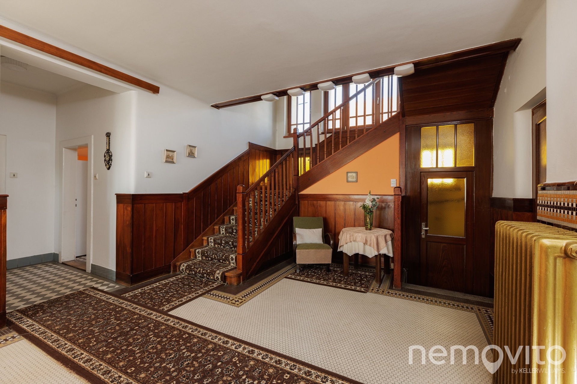 Dominantu stavby tvoří téměř 40 metrová vstupní hala se schodištěm, do které je možné opět umístit kamna. Původní dřevěné schodiště, obložení stěn i mozaiková podlaha jsou skutečnou pastvou pro oči každého fanouška starých domů. Přestože má téměř 90 let, dispozice je řešena velmi prakticky. Na každém podlaží je sociální zázemí a pokoje jsou prostorné. Ložnice jsou navíc orientované směrem do zahrady, tedy na západní stranu.