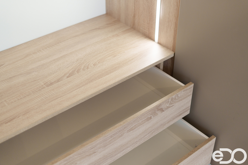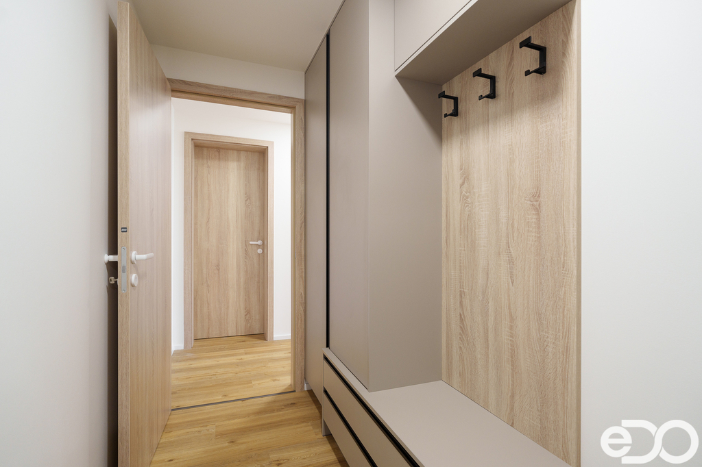 Součástí bytu je moderní kuchyňská linka včetně spotřebičů – myčky nádobí, indukční varné desky, lednice s mrazákem. V chodbě je k dispozici vestavěná skříň a také v ložnici, která nabízí komfortní úložný prostor.