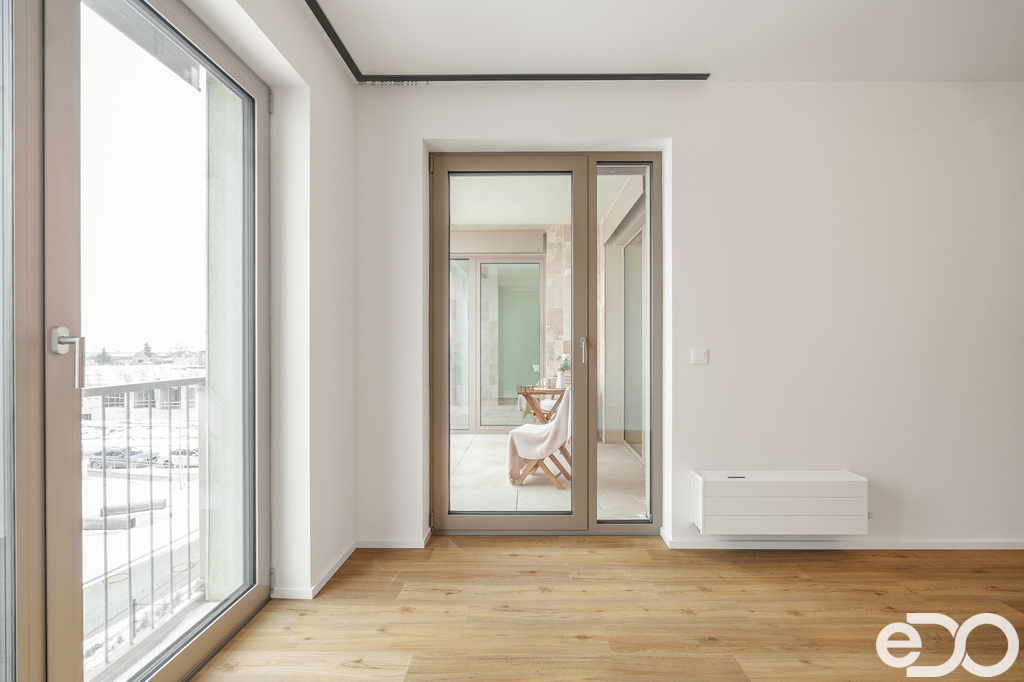 Byt se nachází v novostavbě a čeká na svého prvního nájemníka. Moderní dispozice nabízí prostorný obývací pokoj s kuchyňským koutem, dvě samostatné ložnice, koupelnu a dostatek úložného prostoru. Ze všech pokojů je vstup na terasu o velikosti 8,30 m², která poskytuje příjemné místo k relaxaci.