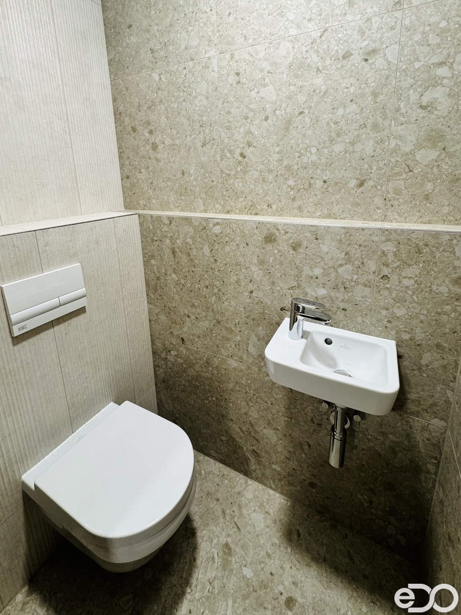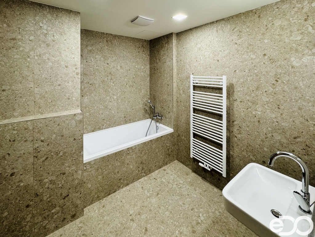 Byt se nachází v cihlové novostavbě a čeká na své první nájemníky. Moderní dispozice nabízí prostorný obývací pokoj s kuchyňským koutem, ložnici, prostornou předsíň, koupelnu s vanou a samostatnou toaletu. Z obývacího pokoje i ložnice je vstup na 2 lodžie o celkové výměře 9,5 m², které poskytují příjemné místo k relaxaci. Součástí bytu je krásná a moderní kuchyňská linka, která je vybavena veškerými spotřebiči: elektrická trouba, indukční varná deska, digestoř, myčka a lednice s mrazákem. V ložnici je k dispozici prostorná vestavěná skříň, v předsíni pak vestavěný botník s věšáky. Vytápění je zajištěno tepelným čerpadlem, stejně jako ohřev vody. Okna a dveře k lodžii jsou hliníková, podlaha pak vinyl a keramická dlažba. K bytové jednotce dále náleží zděný sklep (3 m²) a garážové stání, které je za příplatek 1 800 Kč měsíčně.