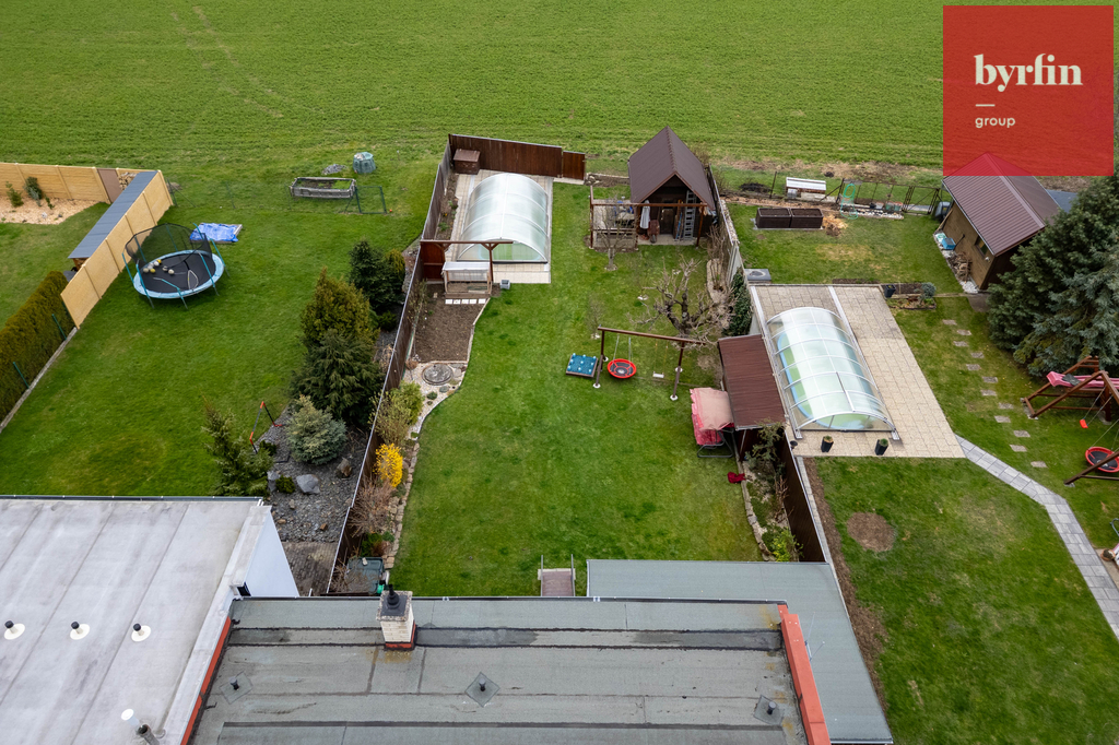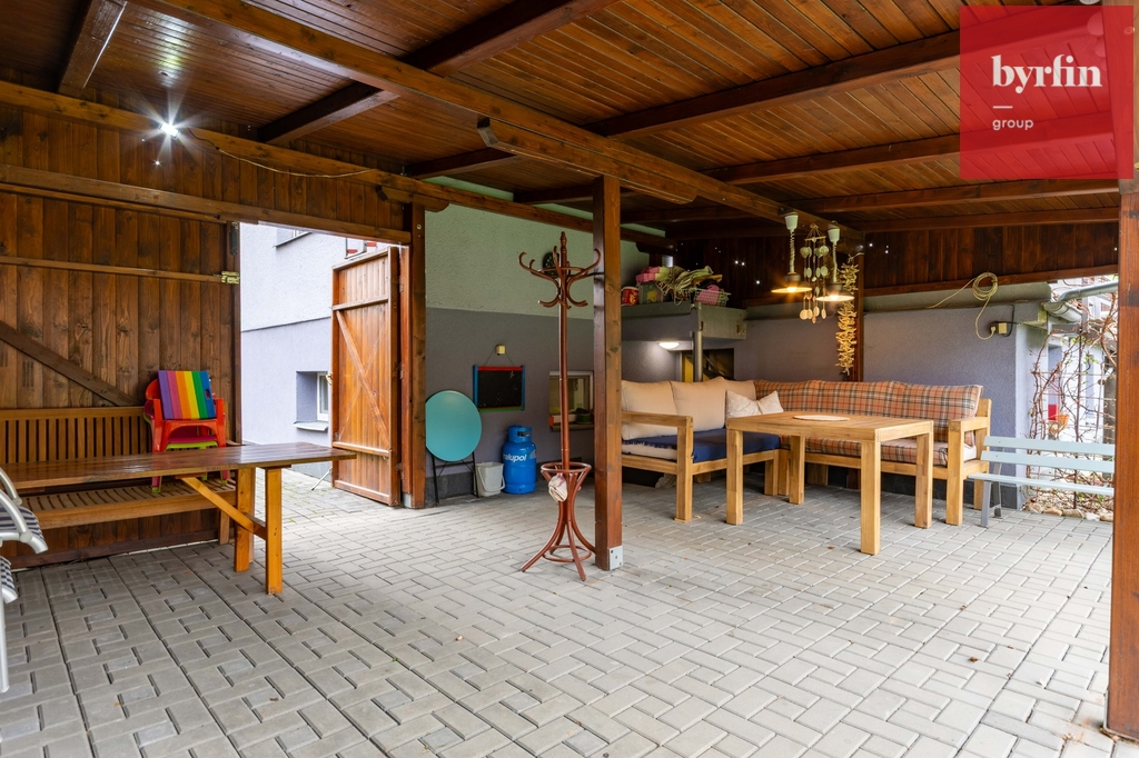 krytou terasu s posezením (29 m²), krytý bazén, zahradní chatku, dřevník, záhony, vzrostlou zeleň.