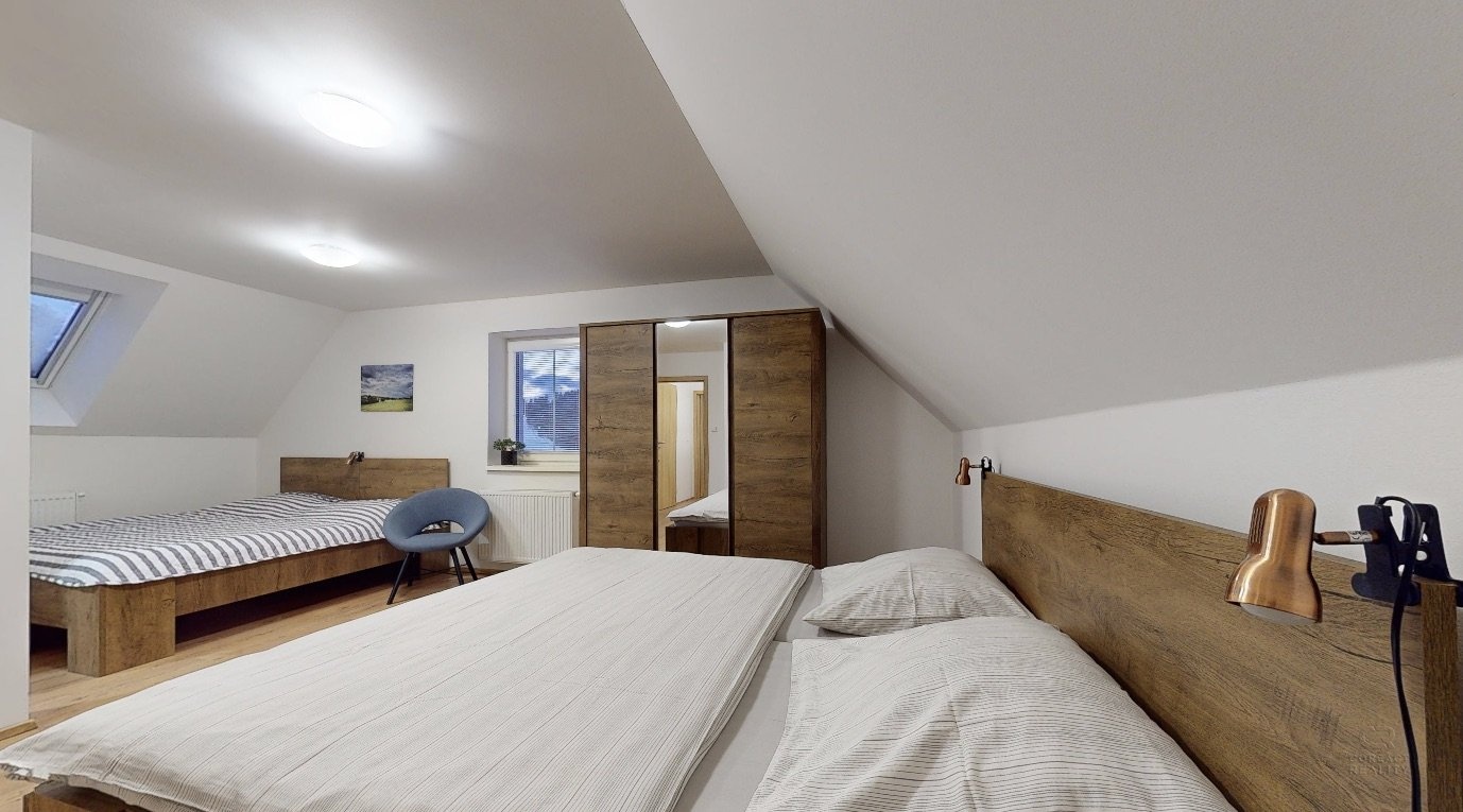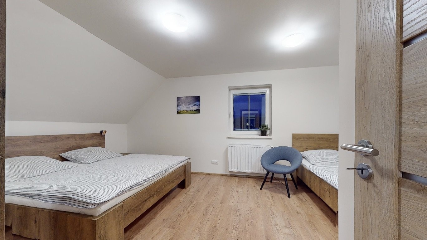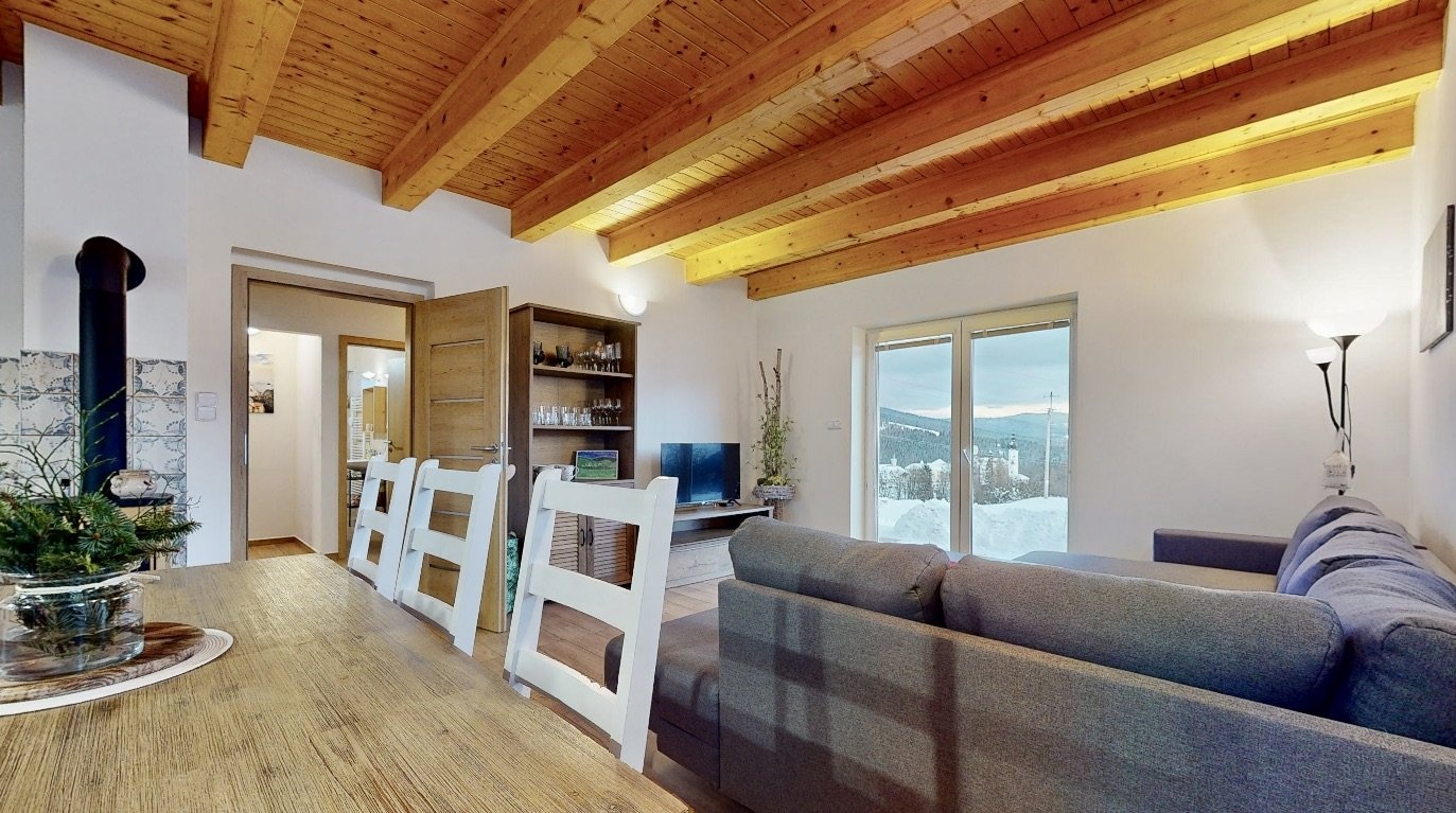 Jedná se o dispozici domu 4+kk ve dvou podlažích, kdy v přízemí se nachází prostorná chodba, lyžárna se šatnou, pokoj pro hosty, velký obývací pokoj s kuchyní, odkud je vidět na sjezdovky, dále prostorná koupelna se sprchovým koutem a pod točeným schodištěm je klidová zóna, kde si můžete přečíst knížku. V patře se nachází dva zrcadlově stejné pokoje a každý z pokojů má navíc svou vlastní koupelnu, což ja opravdu nadstandard pro rodinné bydlení.