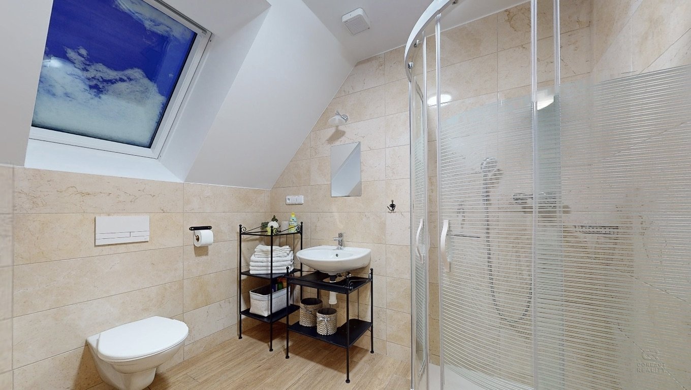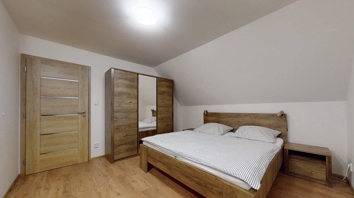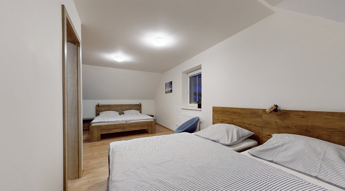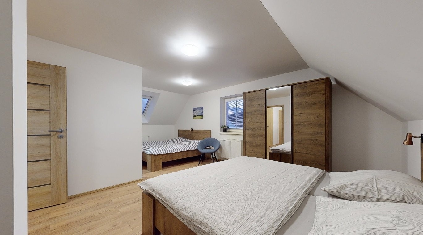 Jedná se o dispozici domu 4+kk ve dvou podlažích, kdy v přízemí se nachází prostorná chodba, lyžárna se šatnou, pokoj pro hosty, velký obývací pokoj s kuchyní, odkud je vidět na sjezdovky, dále prostorná koupelna se sprchovým koutem a pod točeným schodištěm je klidová zóna, kde si můžete přečíst knížku. V patře se nachází dva zrcadlově stejné pokoje a každý z pokojů má navíc svou vlastní koupelnu, což ja opravdu nadstandard pro rodinné bydlení.