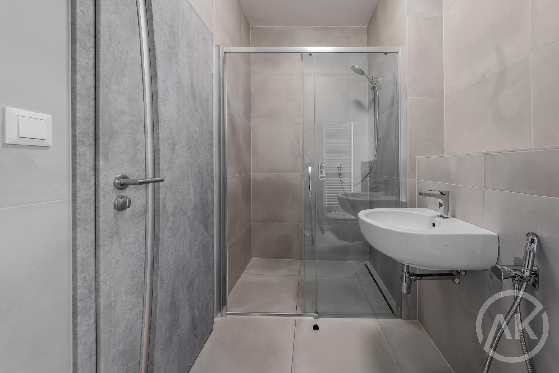 - v koupelně je walk in sprchový kout a okno. To se občas hodí, když to s jídlem přejedete a chystáte se pozvat mámu na návštěvu. Taky se vám tam vejde pračka a sušička,