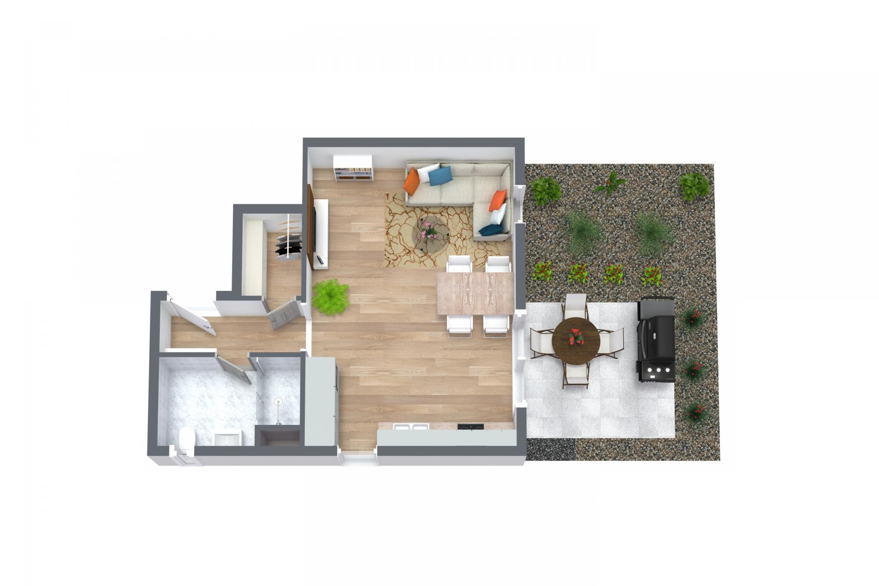 - v bytě je plně vybavená kuchyně, sladěná s ostatními dekory podlah a dveří. Super je taky terasa, pro venkovní posezení nebo grilovačku. Ostatní vybavení už je na vás.