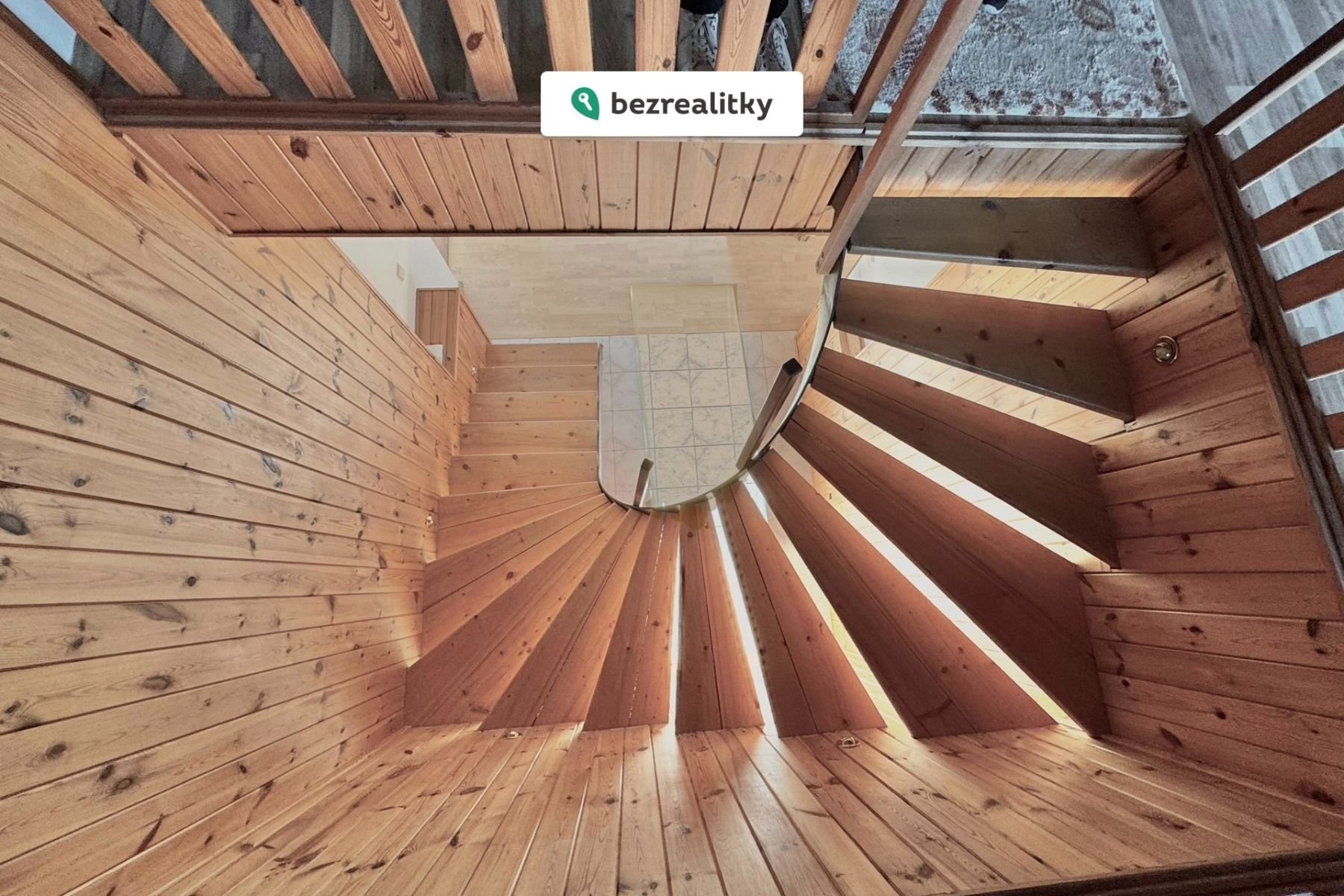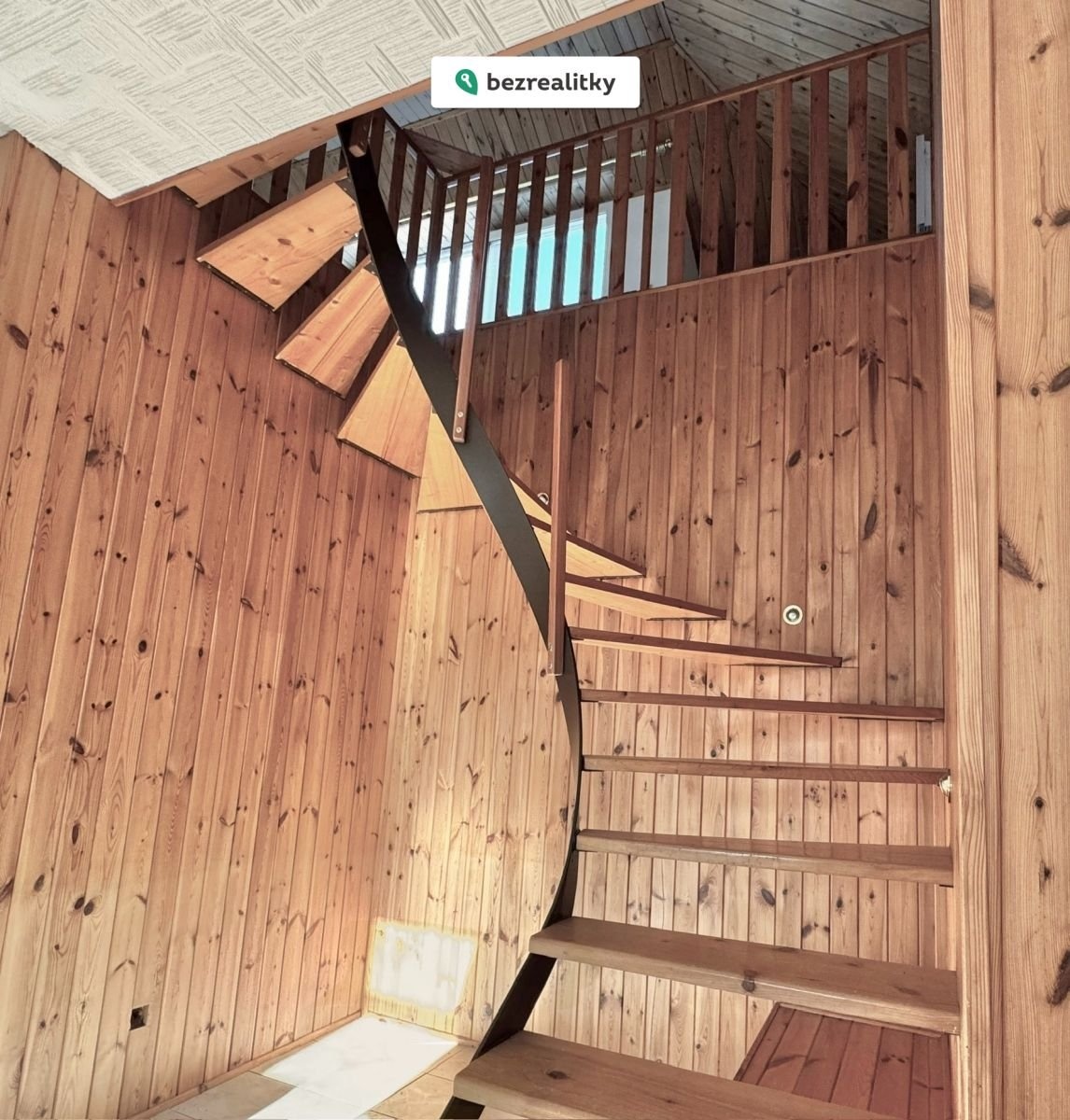 V přízemí bytu je předsíň, dva prostorné pokoje, kuchyň s jídelnou a schodištěm do vrchního patra, koupelna a samostatné WC. Dřevěné schodiště vede do patra, kde se nachází místnost obložená modřínovým dřevem o rozloze 34m2. Tato místnost Vás zaujme funkčním krbem na dřevo a východem na terasu.