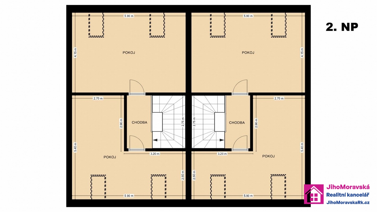 Dispozice domu:1.nadzemní podlaží: předsíň, koupelna (sprchový kout), toaleta, pokoj s kuch. koutem, schodiště a terasa. (oba byty)2.nadzemní podlaží: schodiště, chodba a dva pokoje (oba byty). Půdorysy obou podlaží naleznete ve fotogalerii.