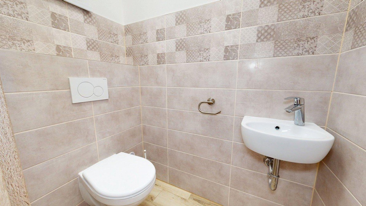 přízemí: předsíň, koupelna (sprchový kout), toaleta, pokoj s kuch. koutem, schodiště a terasa.