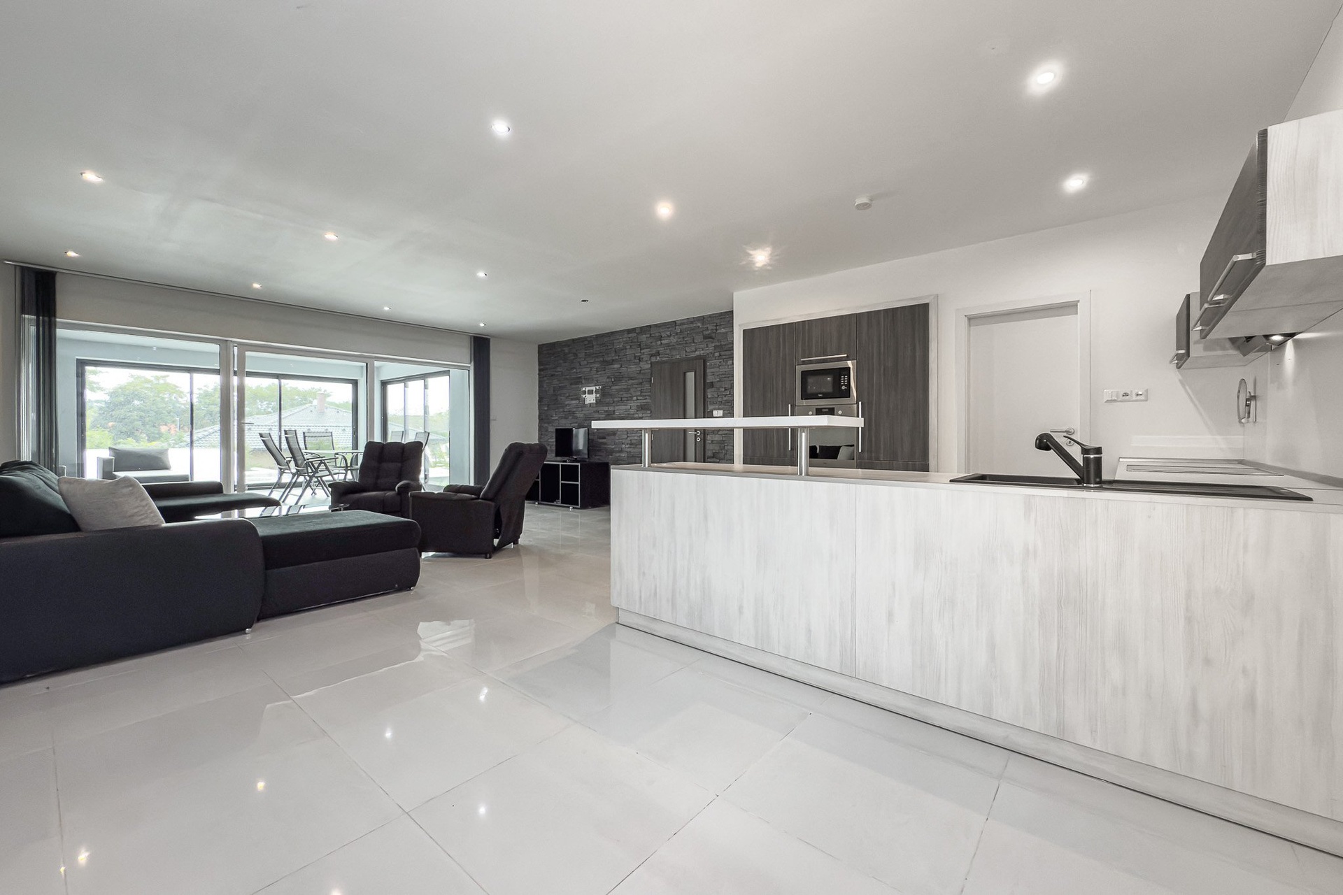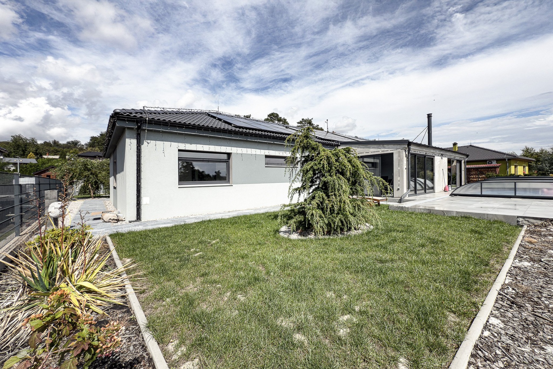 Dispozice domu nabízí vstupní předsíň, technickou místnost, šatnu, koupelnu, samostatné WC, tři pokoje a prostorný obývací pokoj s kuchyní, komorou a zimní zahradou. Právě zimní zahrada je velkým bonusem domu a nabízí příjemné místo k odpočinku po celý rok.