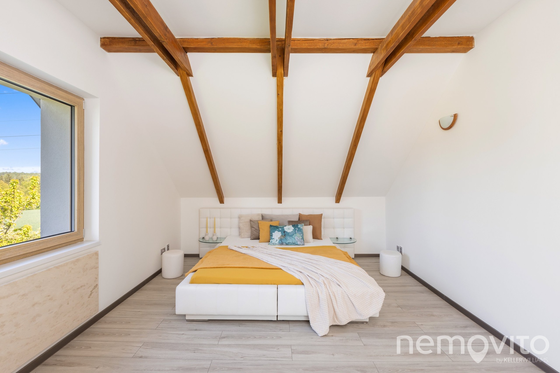Dominantou je mimo zmíněného obýváku, ze kterého je výstup na terasu k bazénu, také hala se schodištěm, které propojuje obě podlaží. Všechny pokoje jsou nahoře, přičemž jedna z částí může fungovat zcela samostatně (vlastní koupelna, připojení na další kuchyni). V této ložnici s proskleným štítem je skutečně působivý výhled z balkonu, který je nad garáží. Následují dva menší pokoje a další sekce, která má vlastní koupelnu i šatnu. Nahoře jsou tak celkem 3 koupelny a možnost samostatného fungování dvou pokojů. Nechybí také velká, plně pochozí a čistá půda.